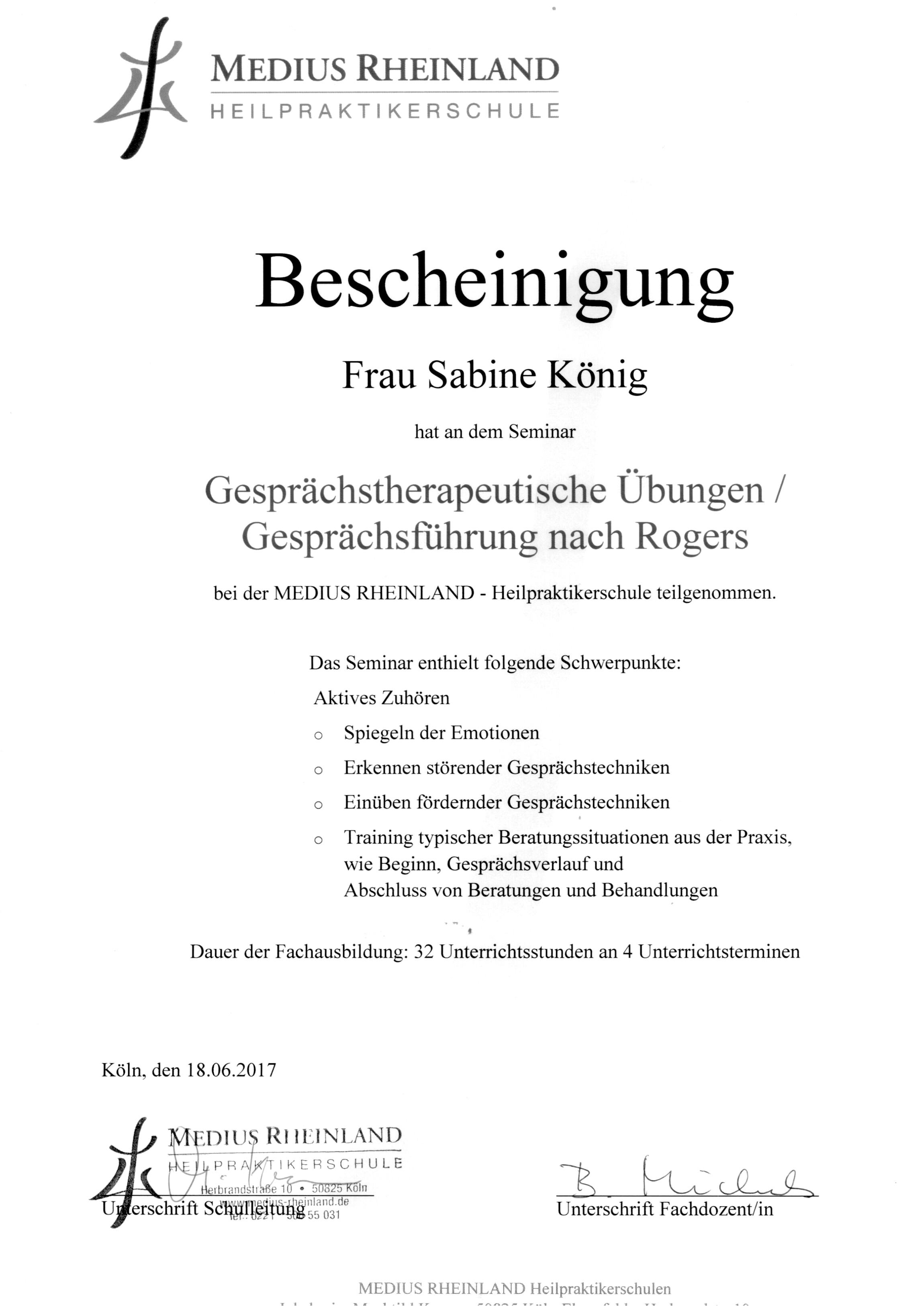 - Gesprächstherapie nach Rogers-Zertifikat seit 2017