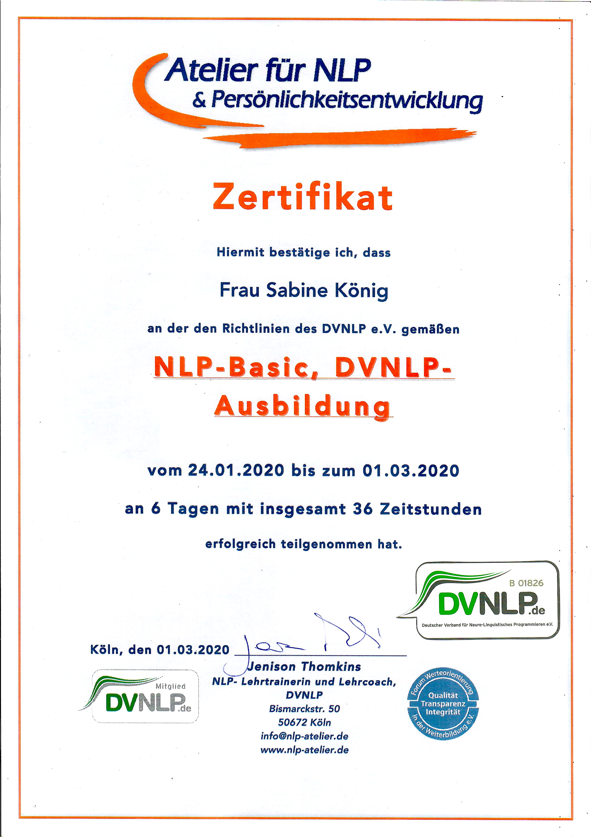 - NLP Basic (nach DVNLP)-Zertifikat seit 2020