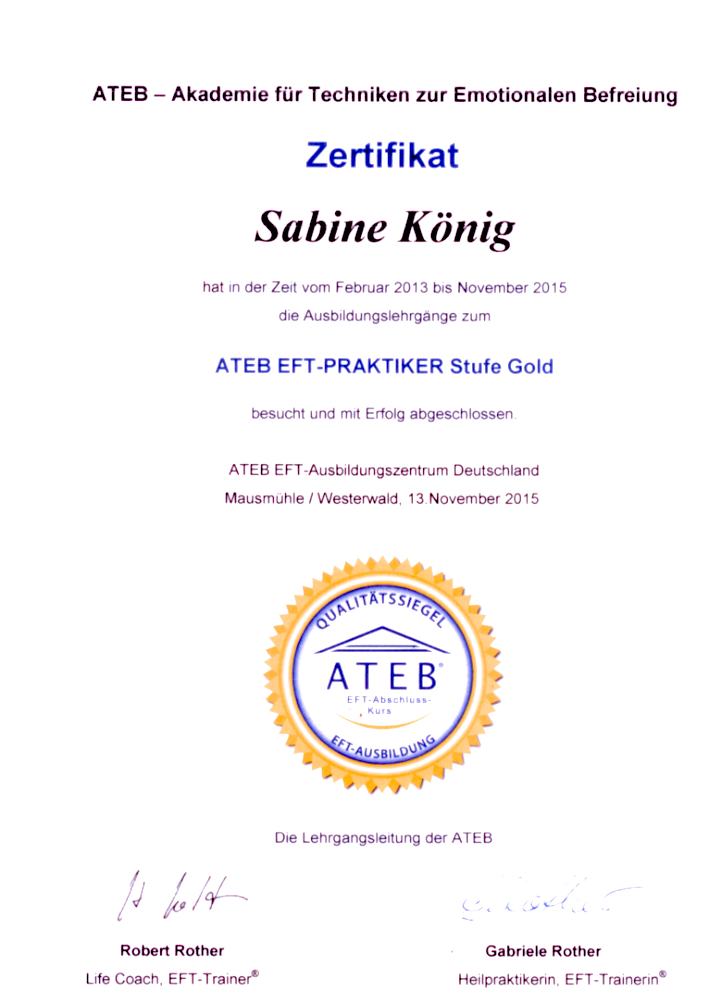 - EFT Practitioner Stufe Gold-Zertifikat seit 2015