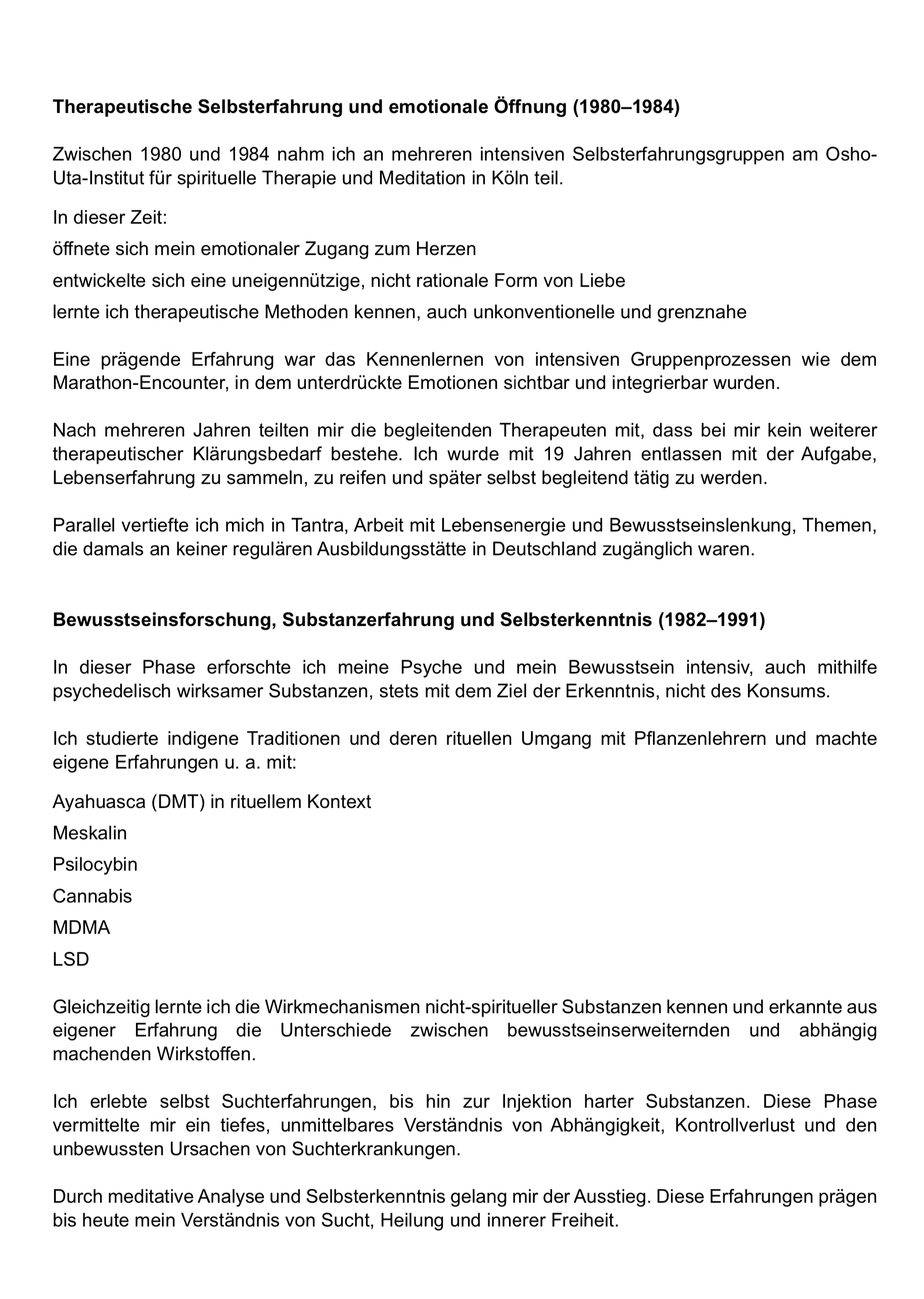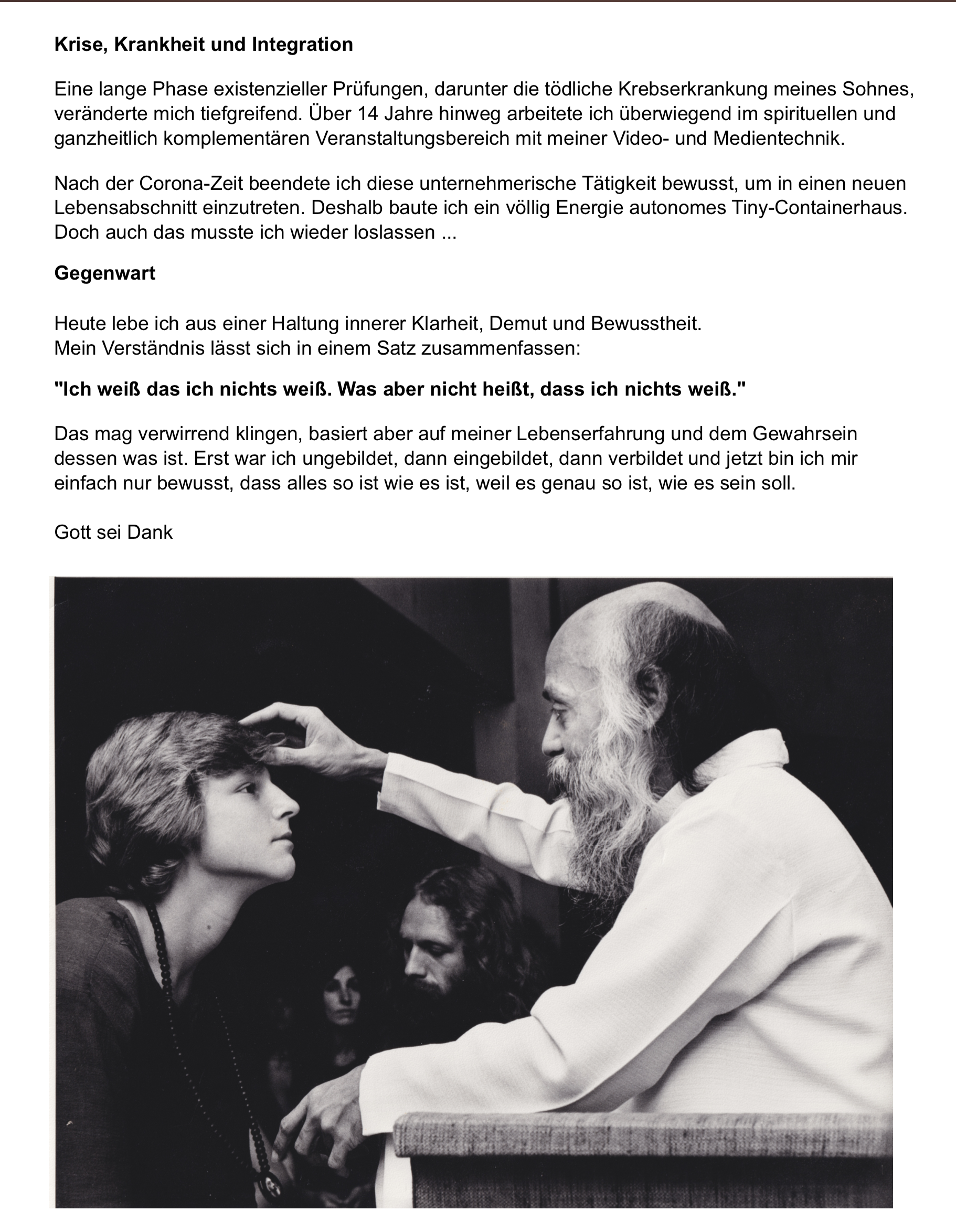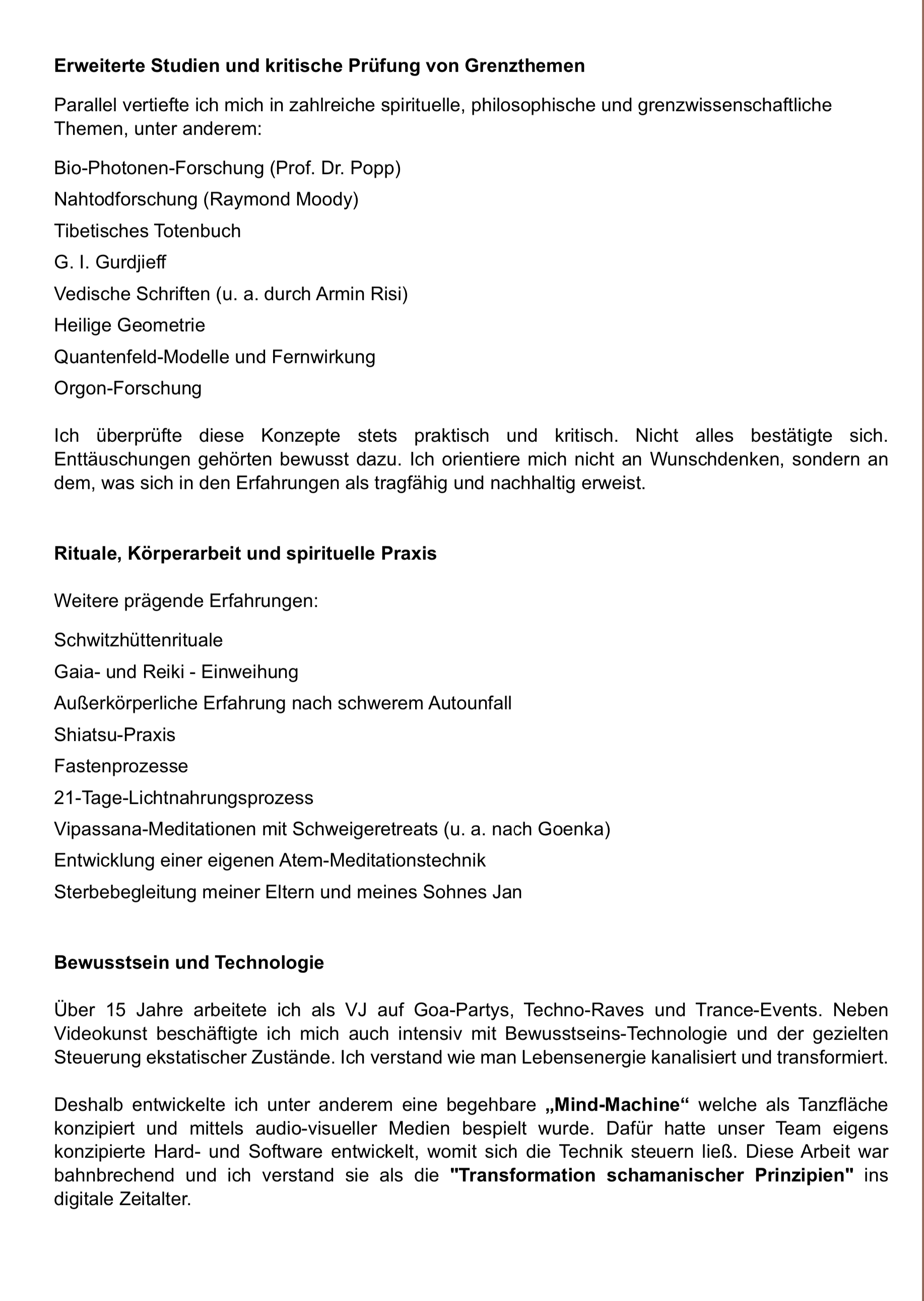 Meine Reportationen basieren auf Erfahrung. Also persönlich angeeignetem Wissen in Kombination einem 30ig jährigem, autodidaktischem Studium von Fachliteratur. Inzwischen habe ich 50 Jahre Meditationserfahrung und bin daher auch als Coach & Begleiter für Menschen in Umbruchzeiten und Phasen der Neuorientierung tätig. Primär in Lebensbereichen, in denen eine akademische Ausbildung nicht genügt um tiefere Ursachen zu ergründen und ganzheitliche Lösungen zu finden. Das bezieht sich vor allem auf Aspekte von Körper, Geist und Seele. Ich unterstütze dabei, diese Aspekte auszubalancieren und gebe Methoden an die Hand, welche bei konsequenter Anwendung zur Selbstermächtigung führen. So kann ein Bewusstseinszustand erreicht werden, in dem Toleranz und Resilienz zunehmen und sich durch Einsicht ein Verständnis einstellt, welches Probleme zu Herausforderungen werden lässt.