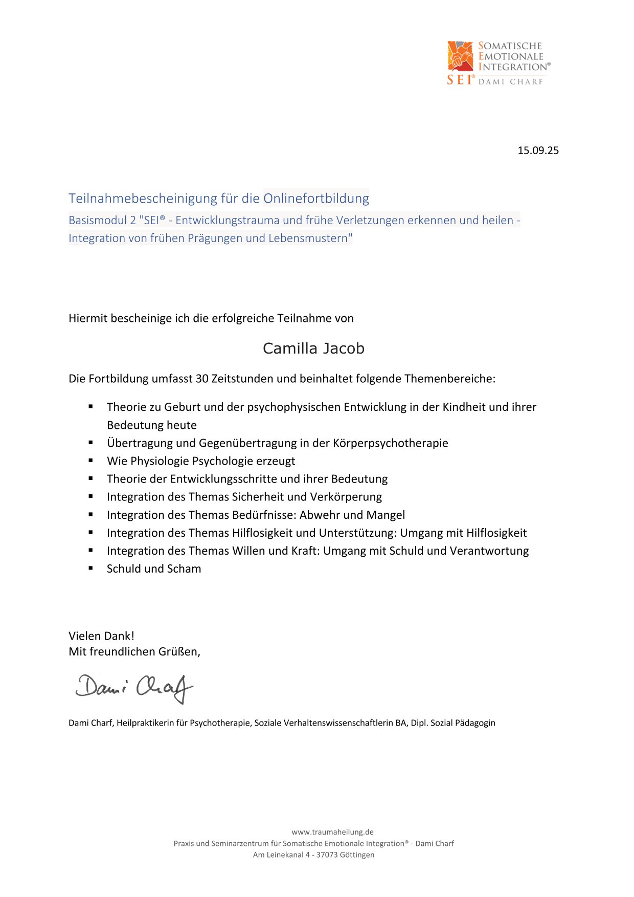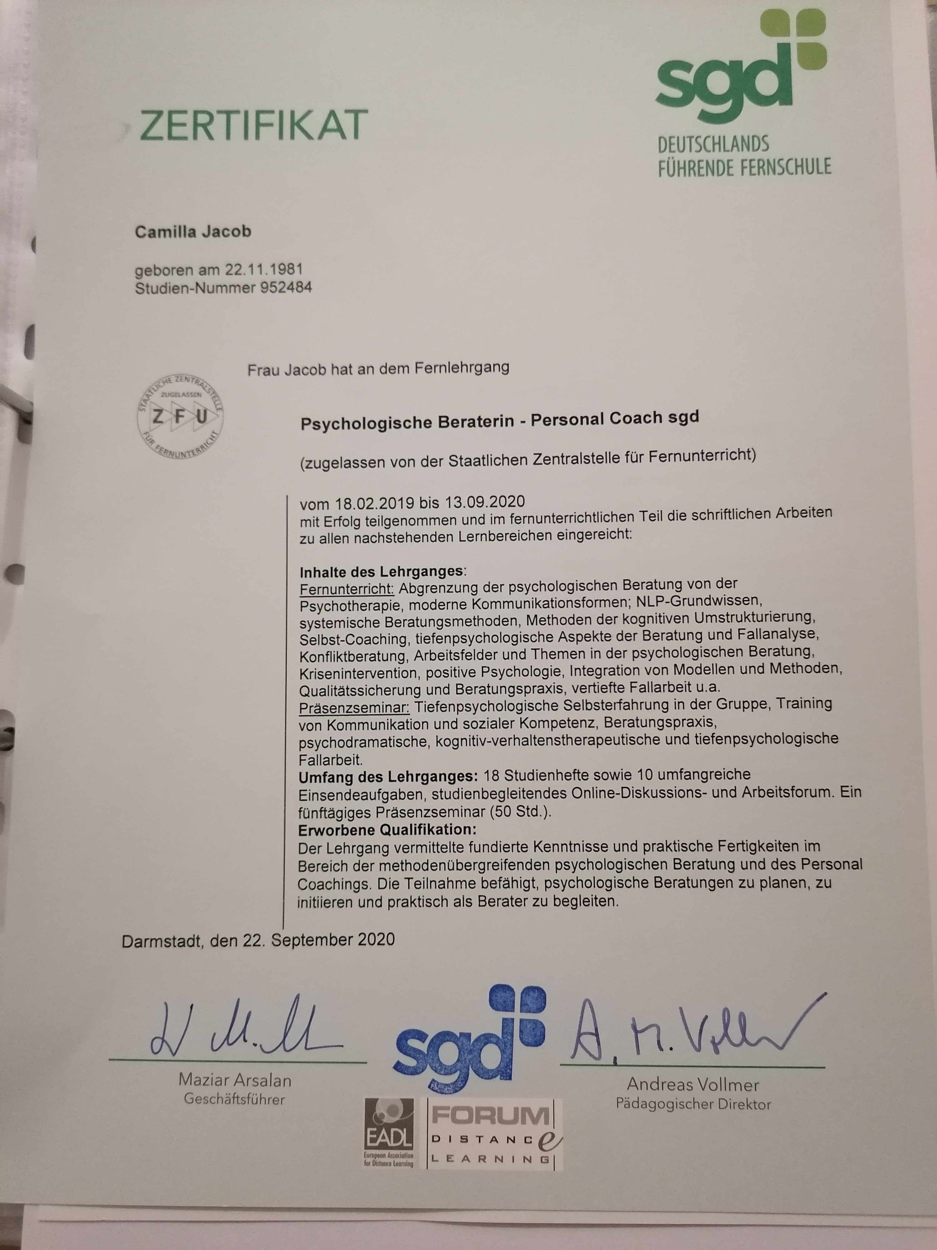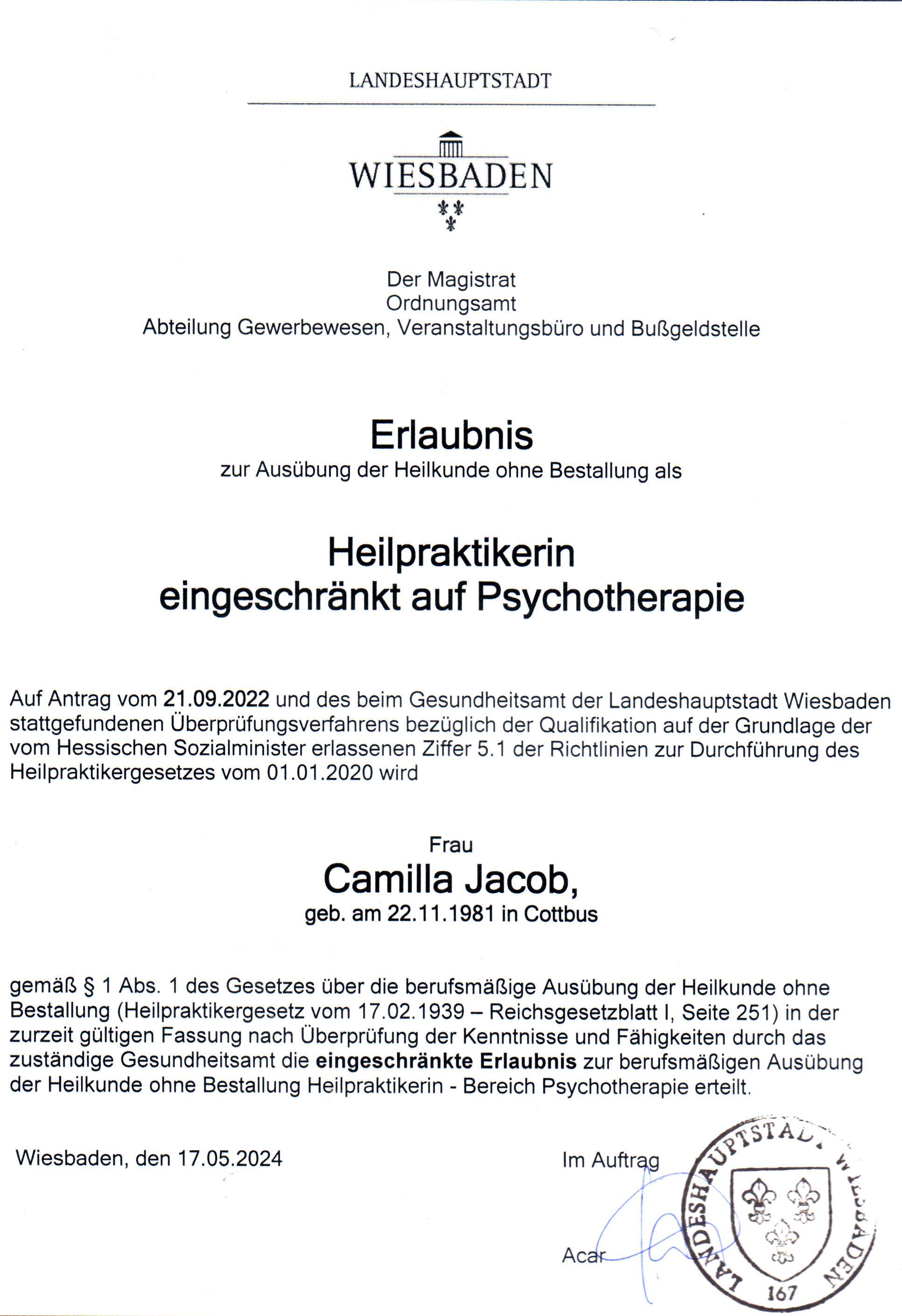 - Heilpraktikerin für Psychotherapie-Zertifikat seit 2024