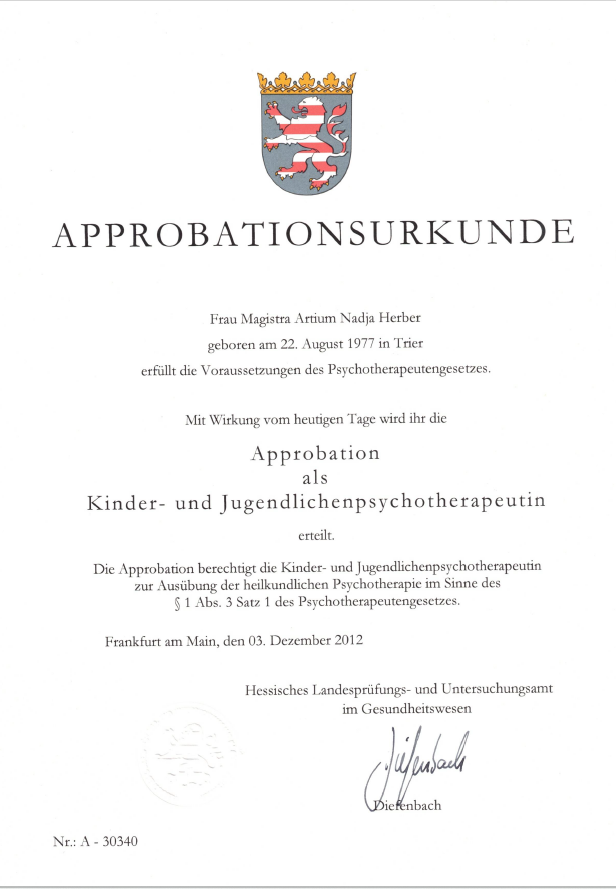 - Approbationsurkunde Kinder- und Jugendlichenpsychotherapie-Zertifikat seit 2014