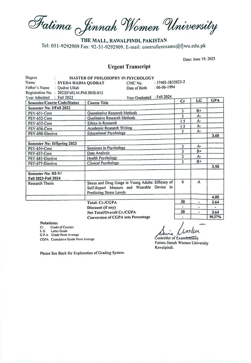- Mphil psychology( Fatima Jinnah uni in 2024