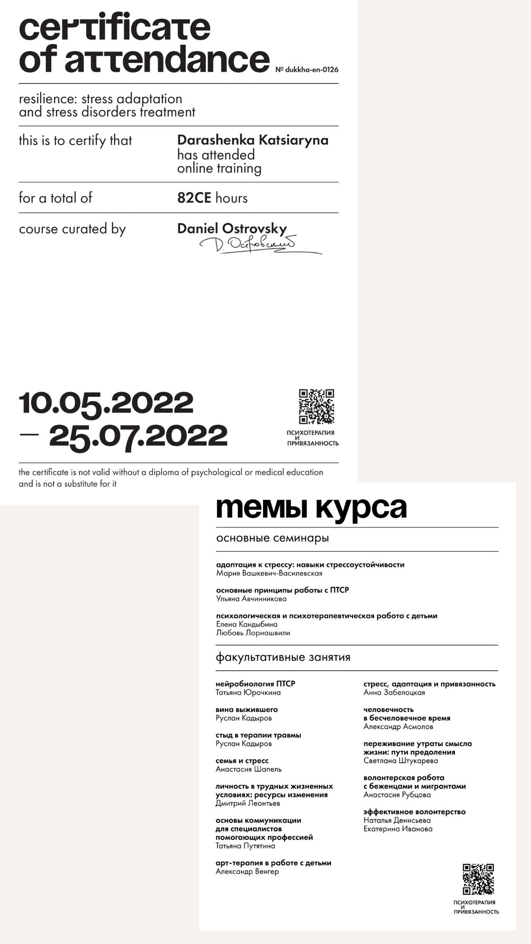 - Resilience: Adaptation to Stress and Treatment of Stress Disorders certificate since 2022