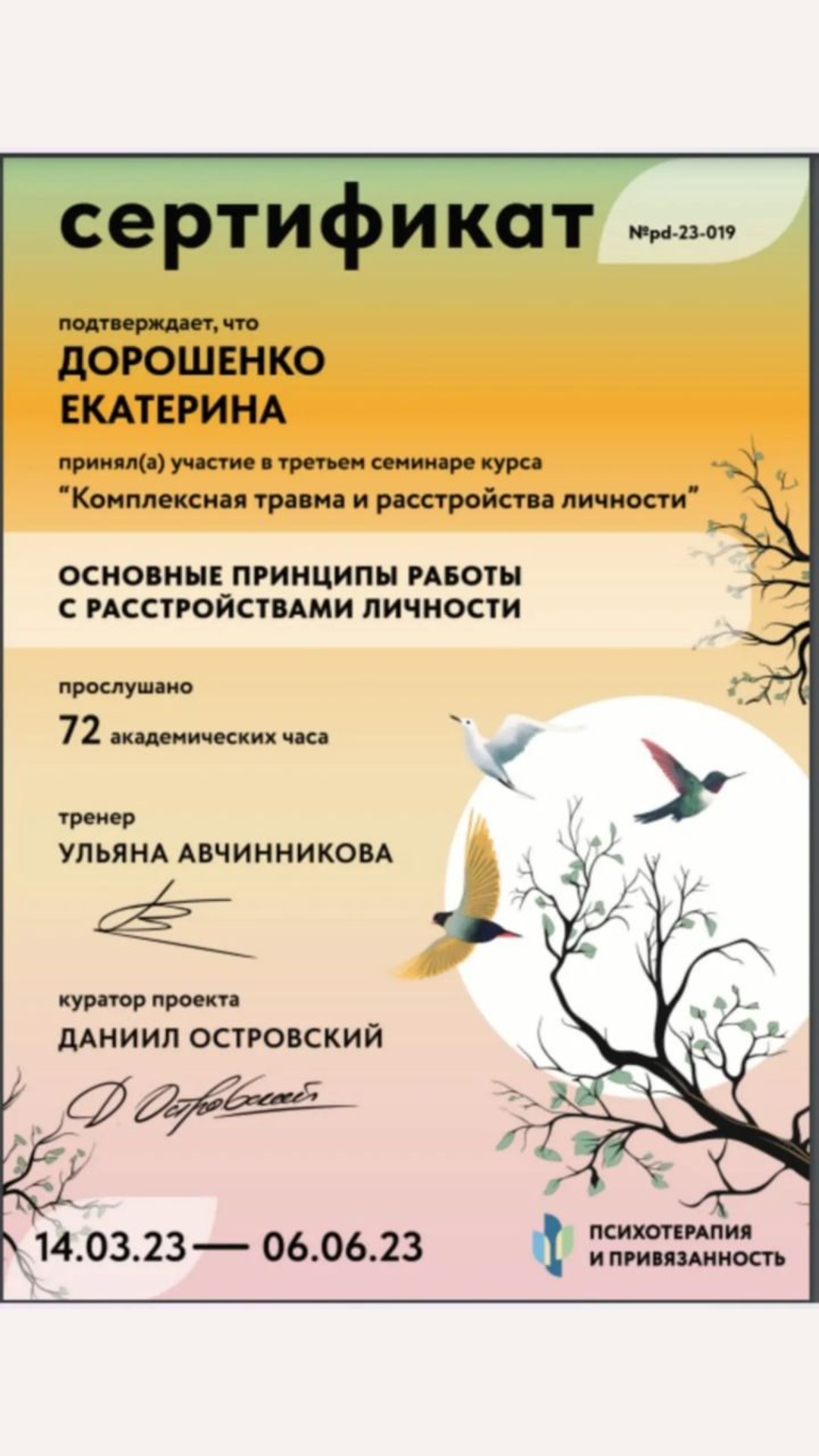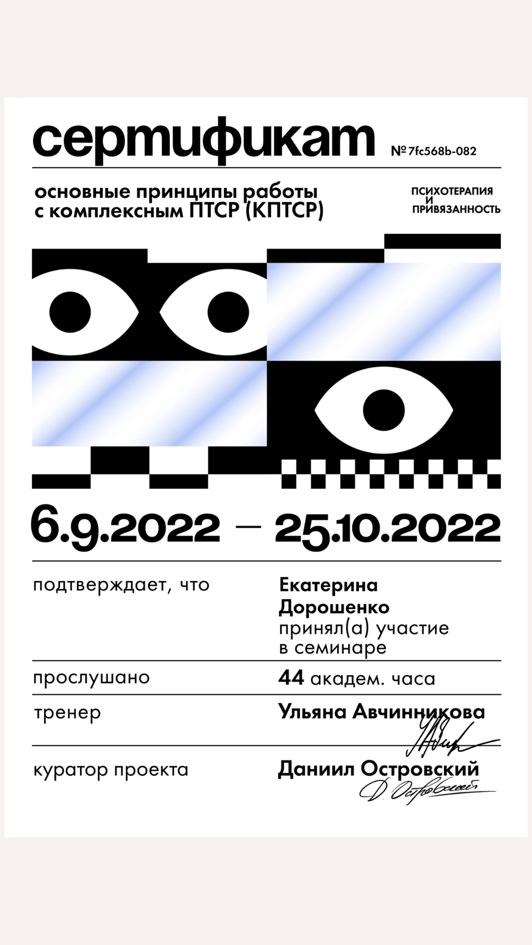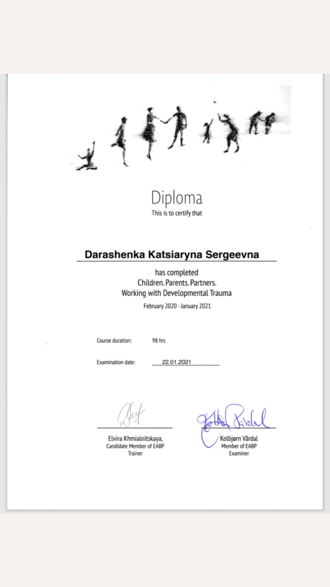 - Core Principles of Working with Complex PTSD (C-PTSD) certificate since 2022