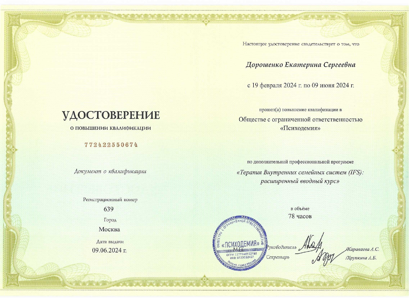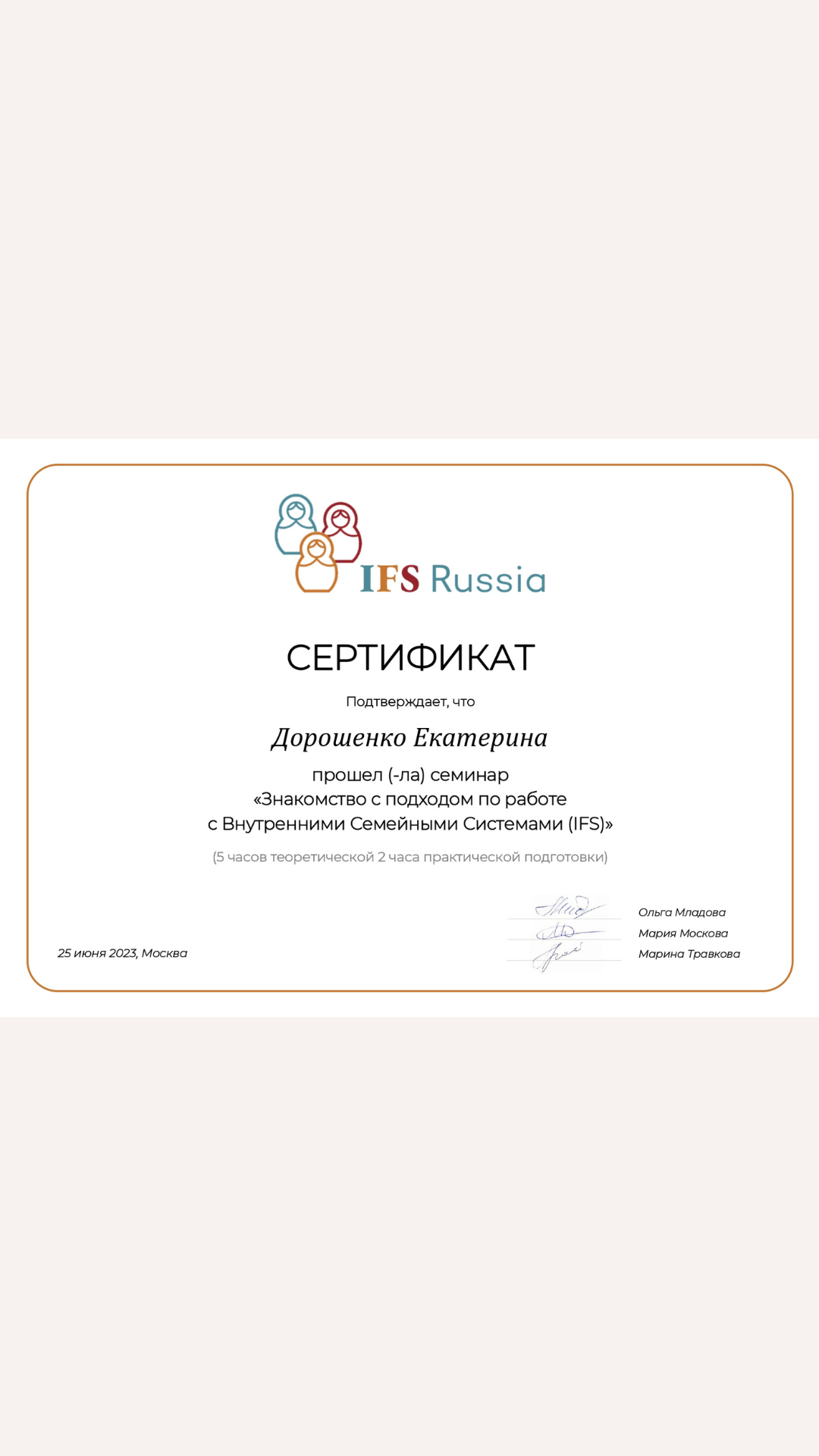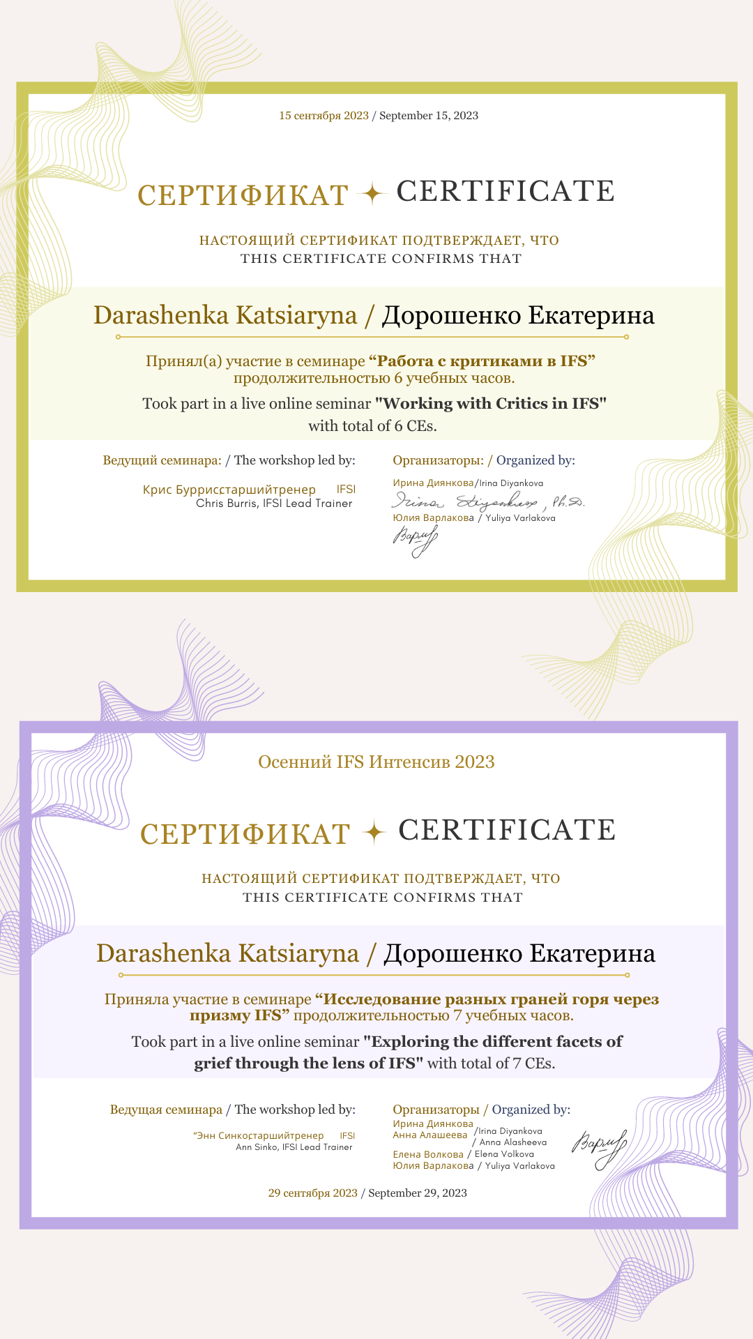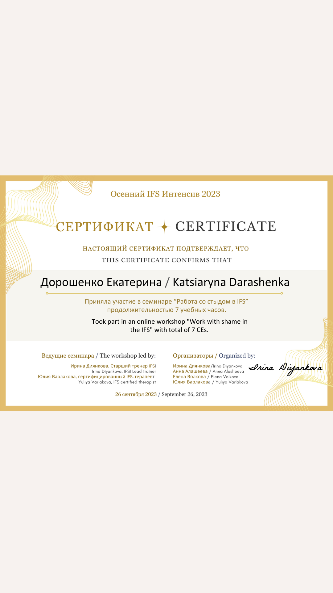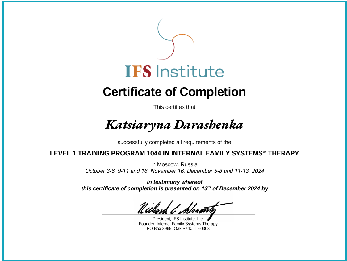 - Internal Family Systems (IFS) Therapy: Extended Introductory Course certificate since 2 certificate since 2024
