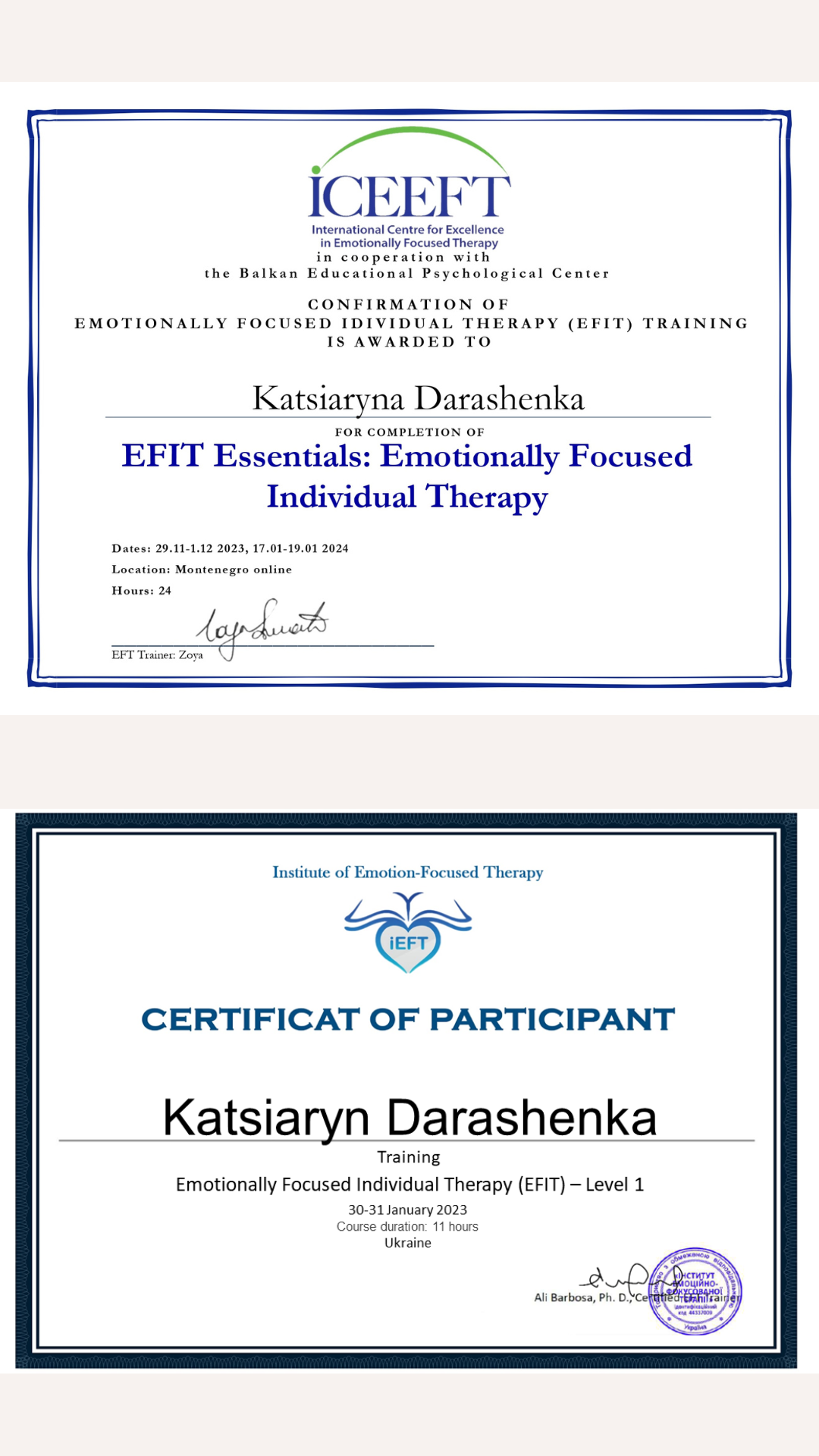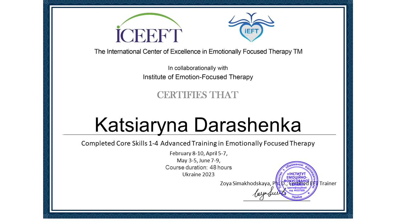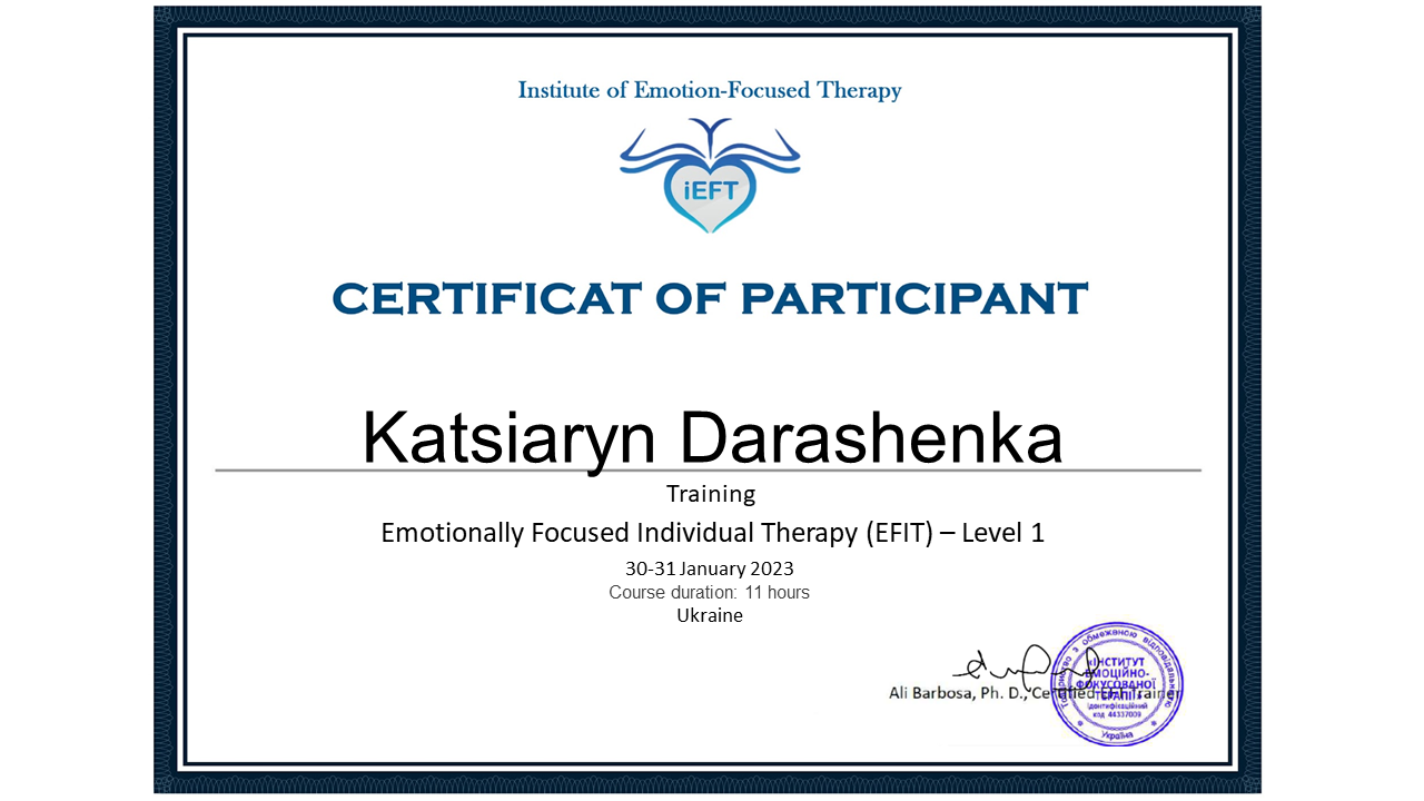 - Training: EFIT Essentials: Emotionally Focused Individual Therapy certificate since 2024