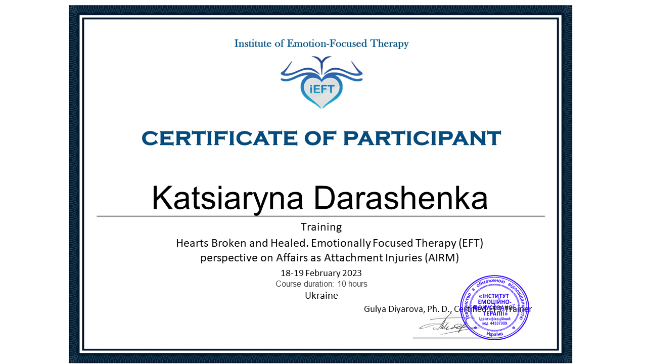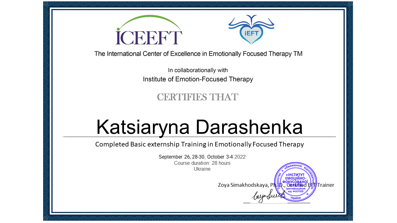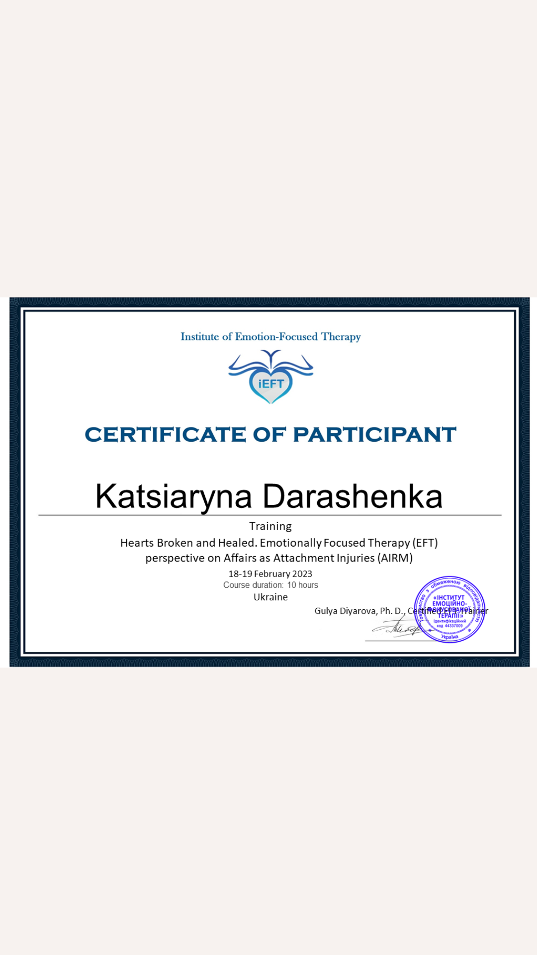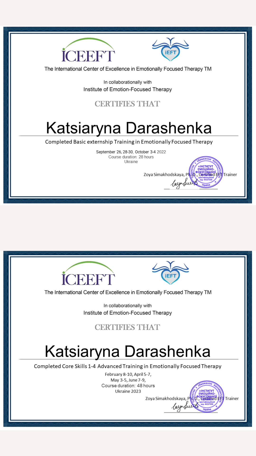 - Training: EFIT Essentials: Emotionally Focused Individual Therapy certificate since 2024