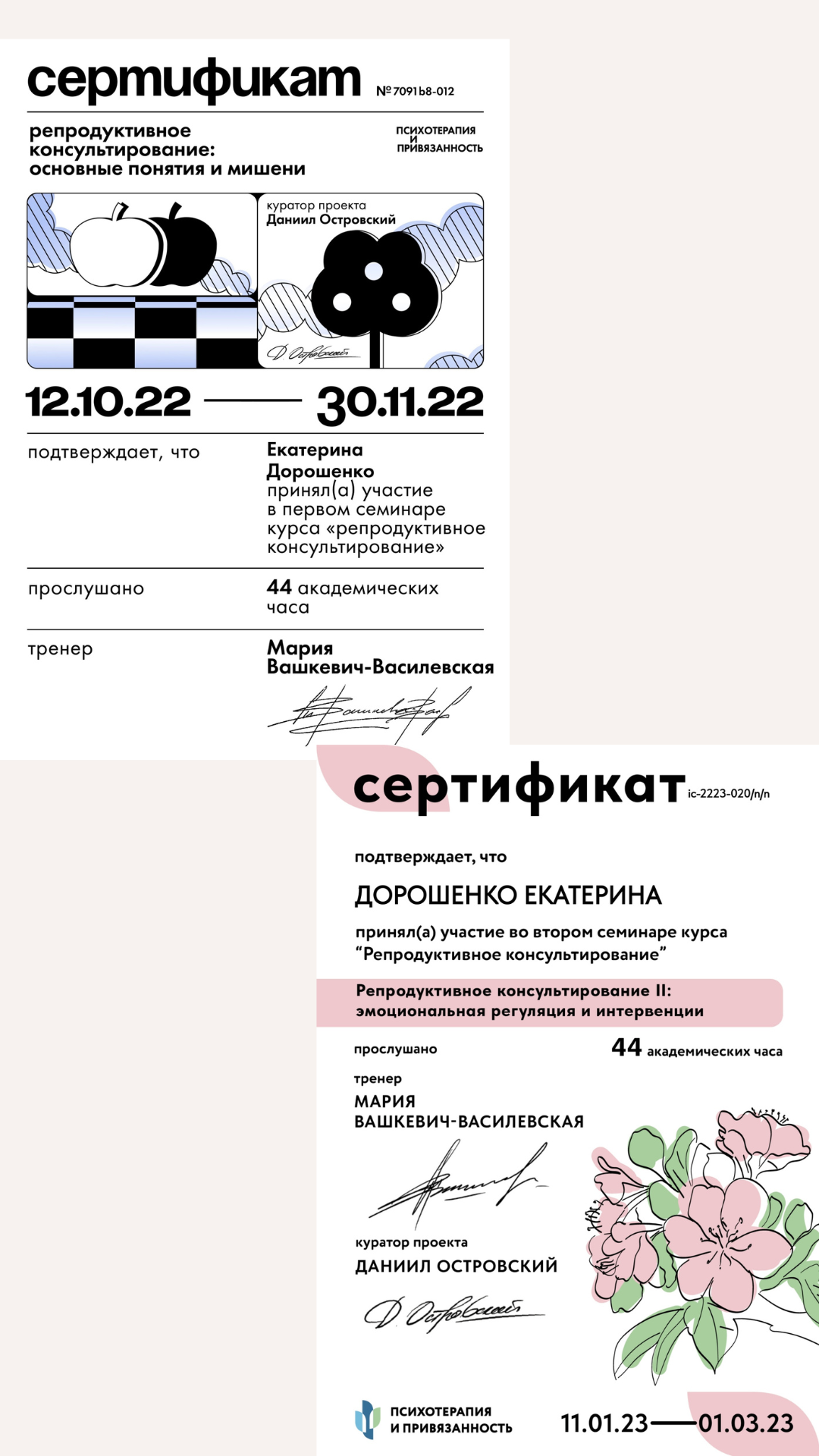 - Reproductive Counseling II: Emotional Regulation and Interventions certificate since 2023