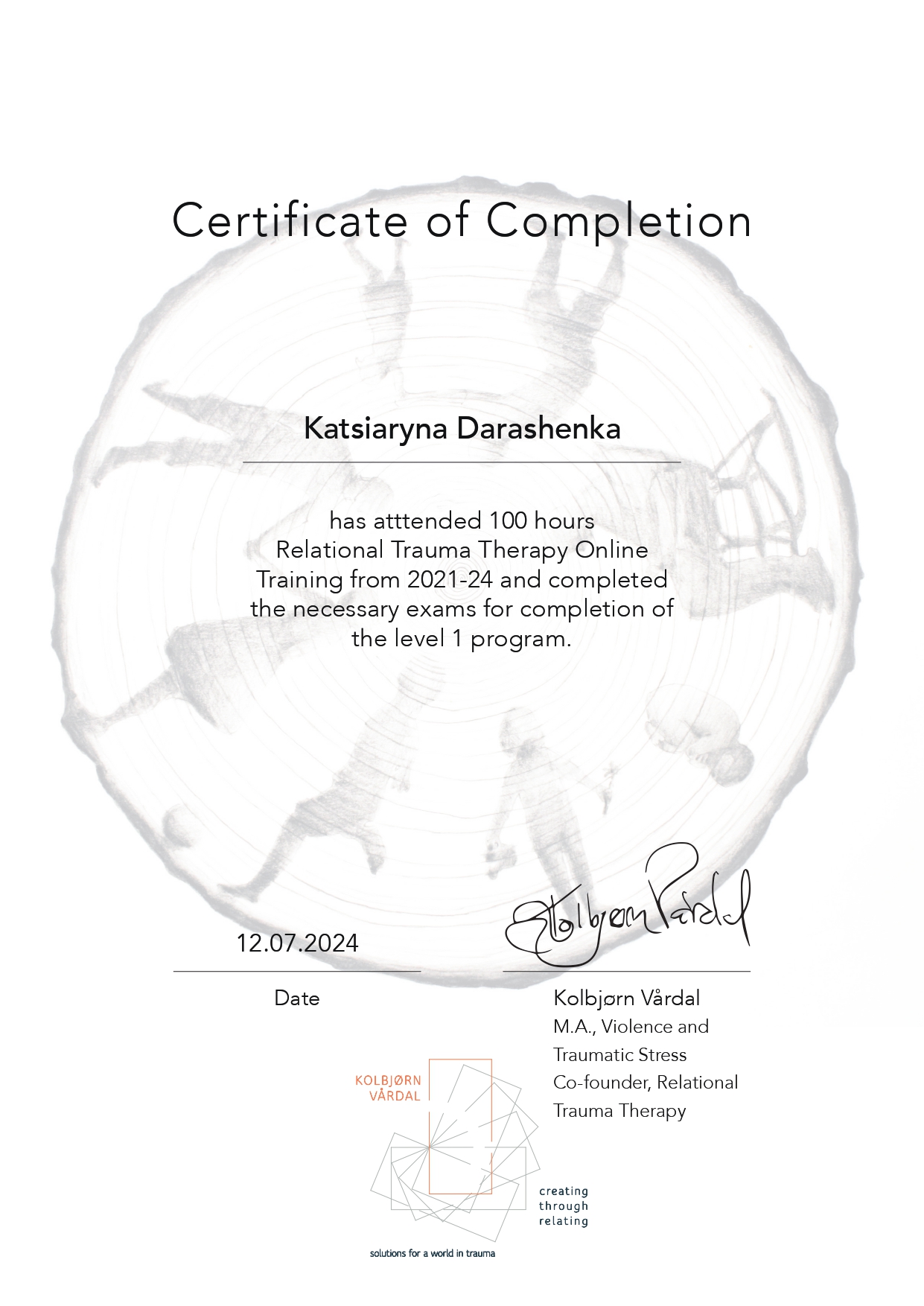 - Relational Trauma Therapy Online Training from 2021-24 and completed the necessary exams for completion of the level 1 program. certificate since 2022