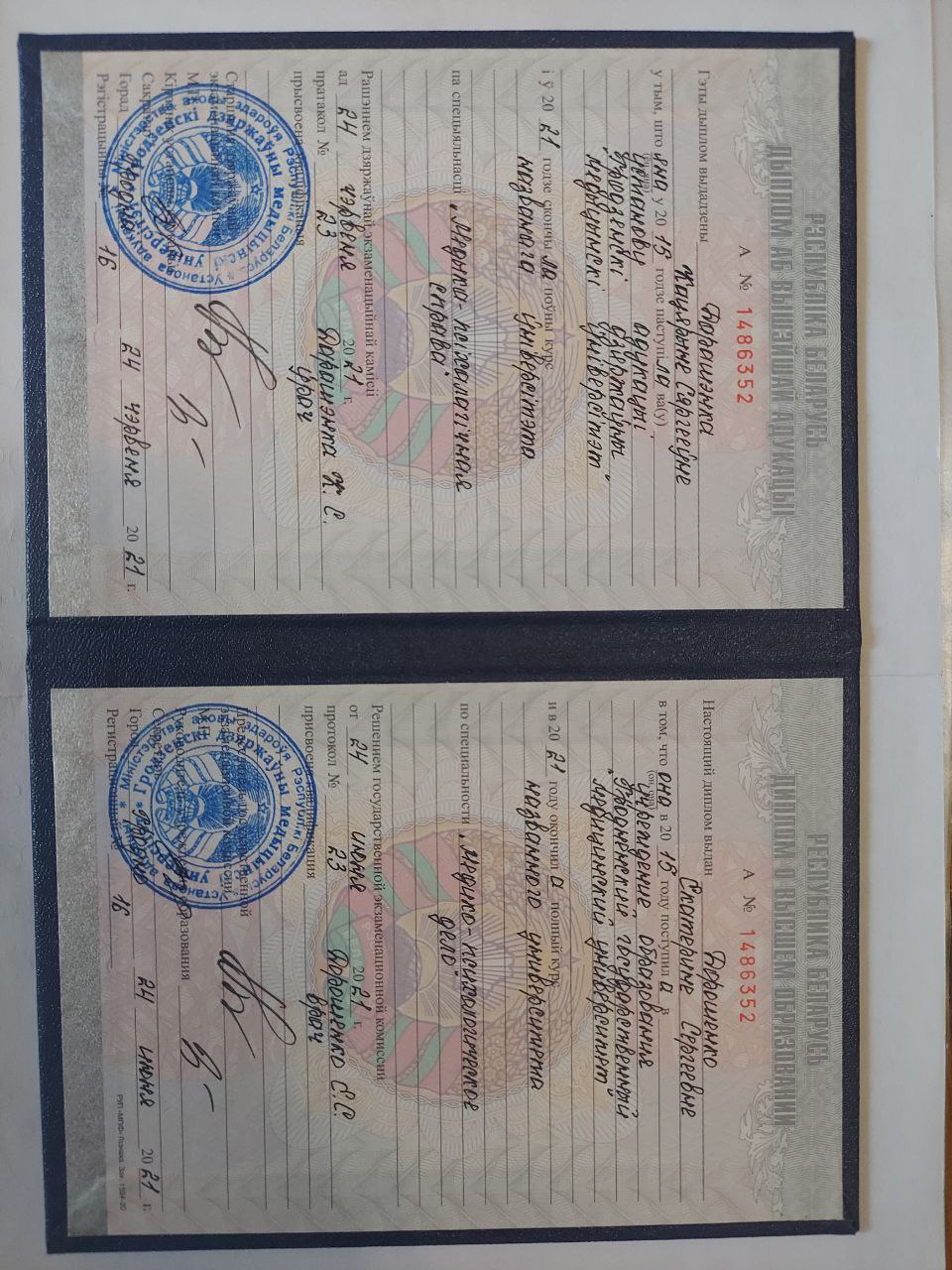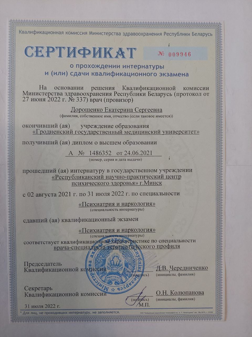 - Medical intern - Republican Scientific and Practical Centre for Mental Health, Minsk (2021 - 2022)