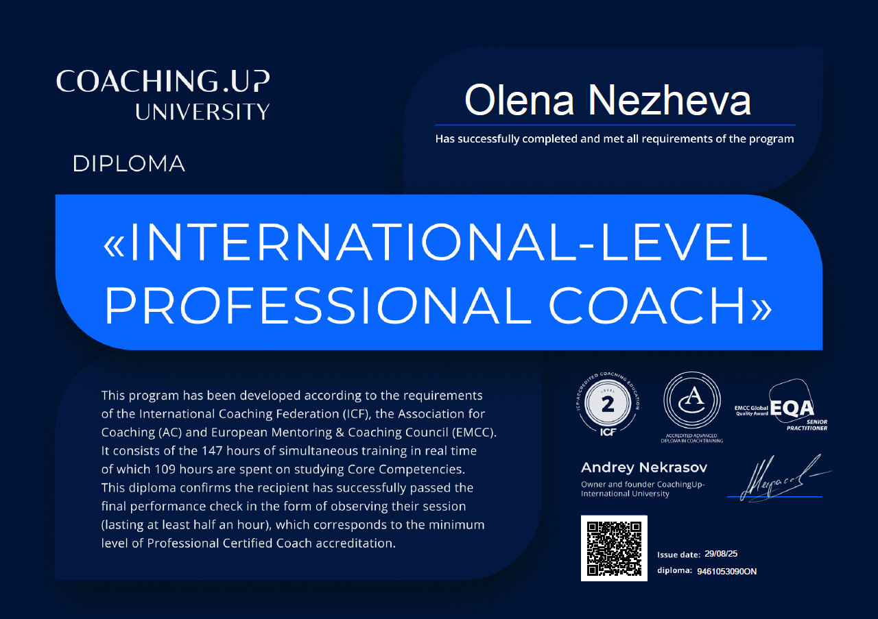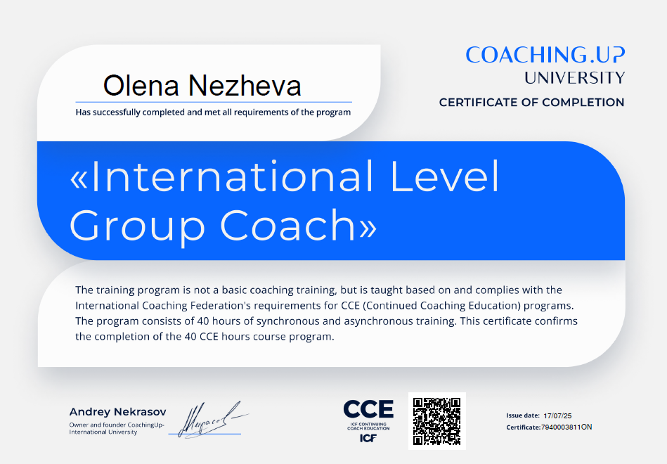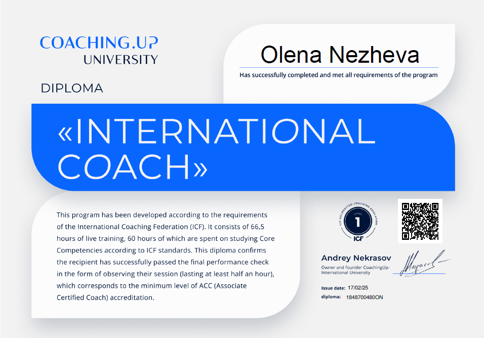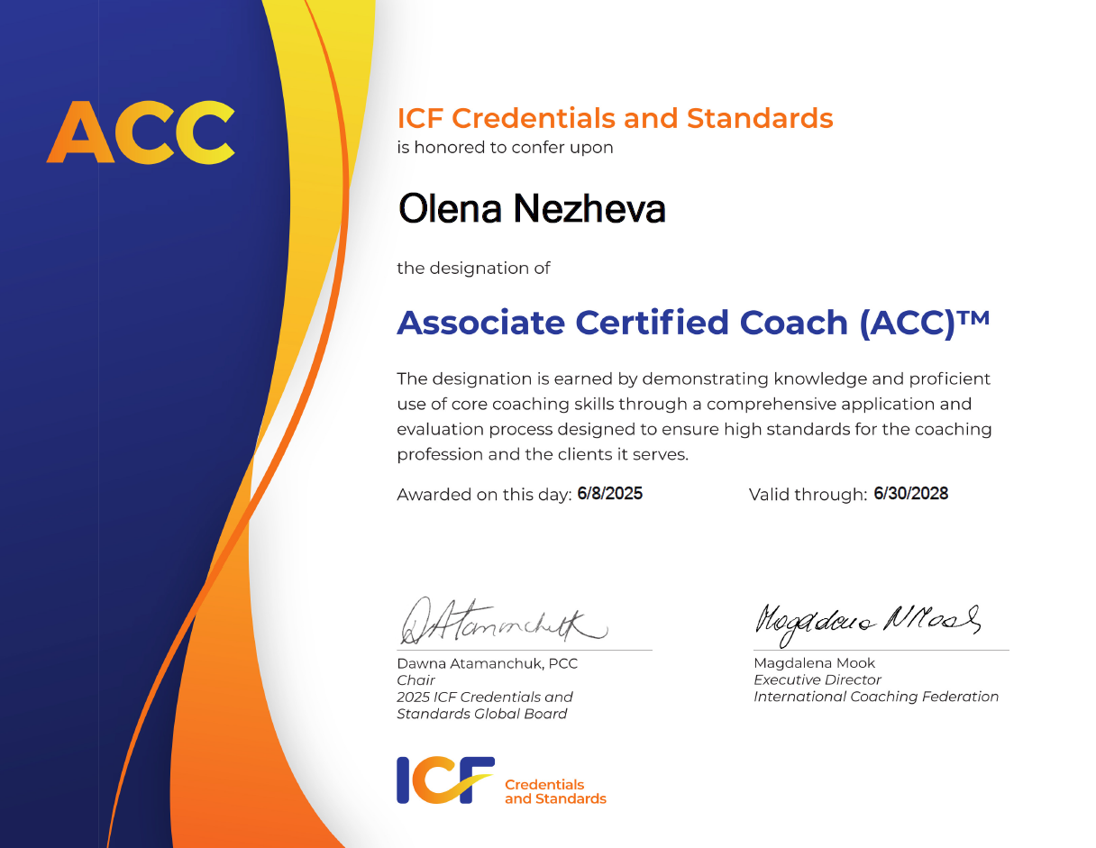 Hi! I’m Olena, a professional coach. I support people in gaining clarity, exploring possibilities, and taking confident steps toward the life and goals they want to create.