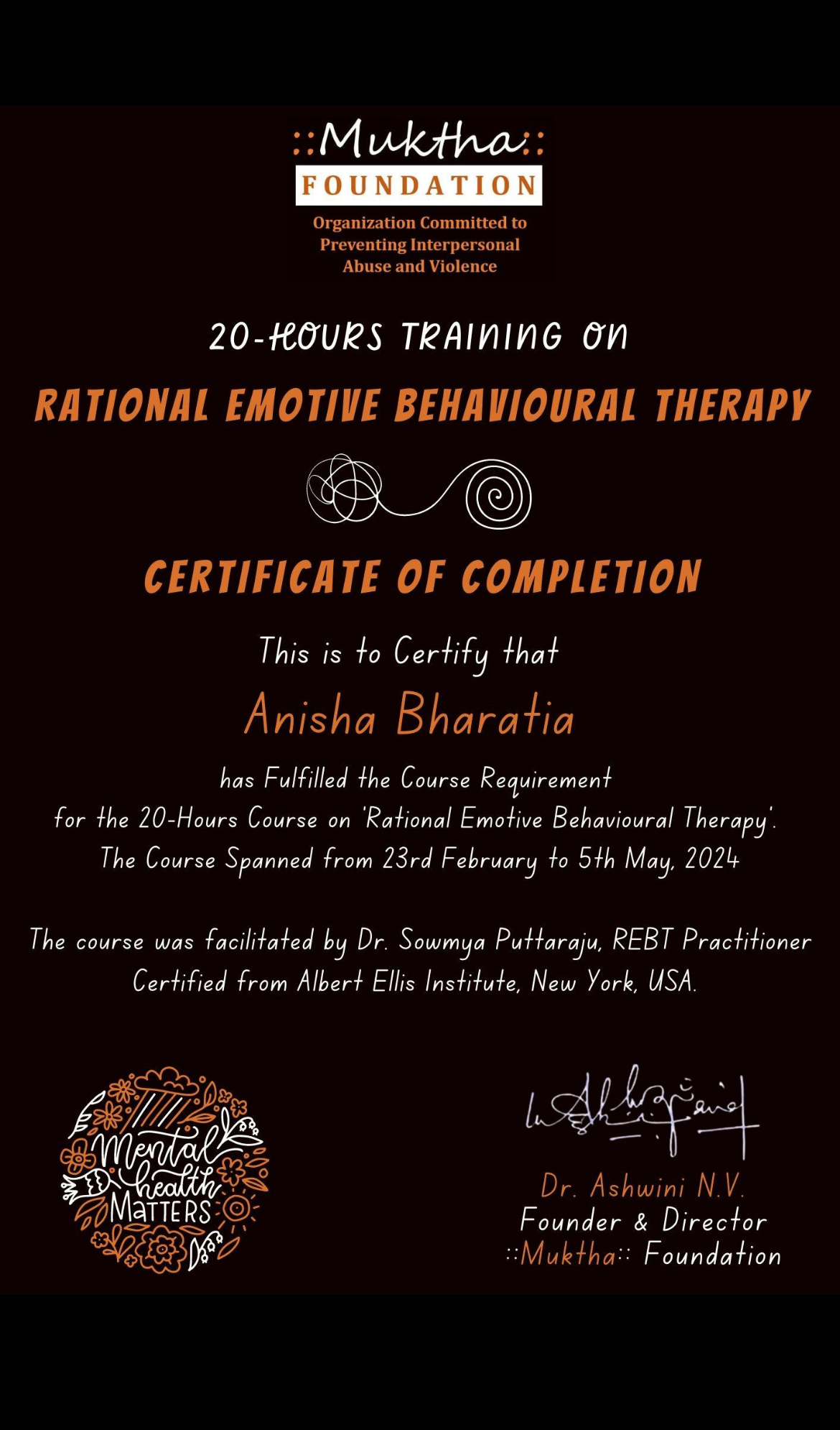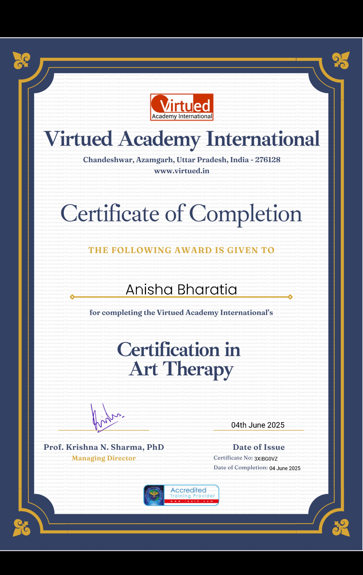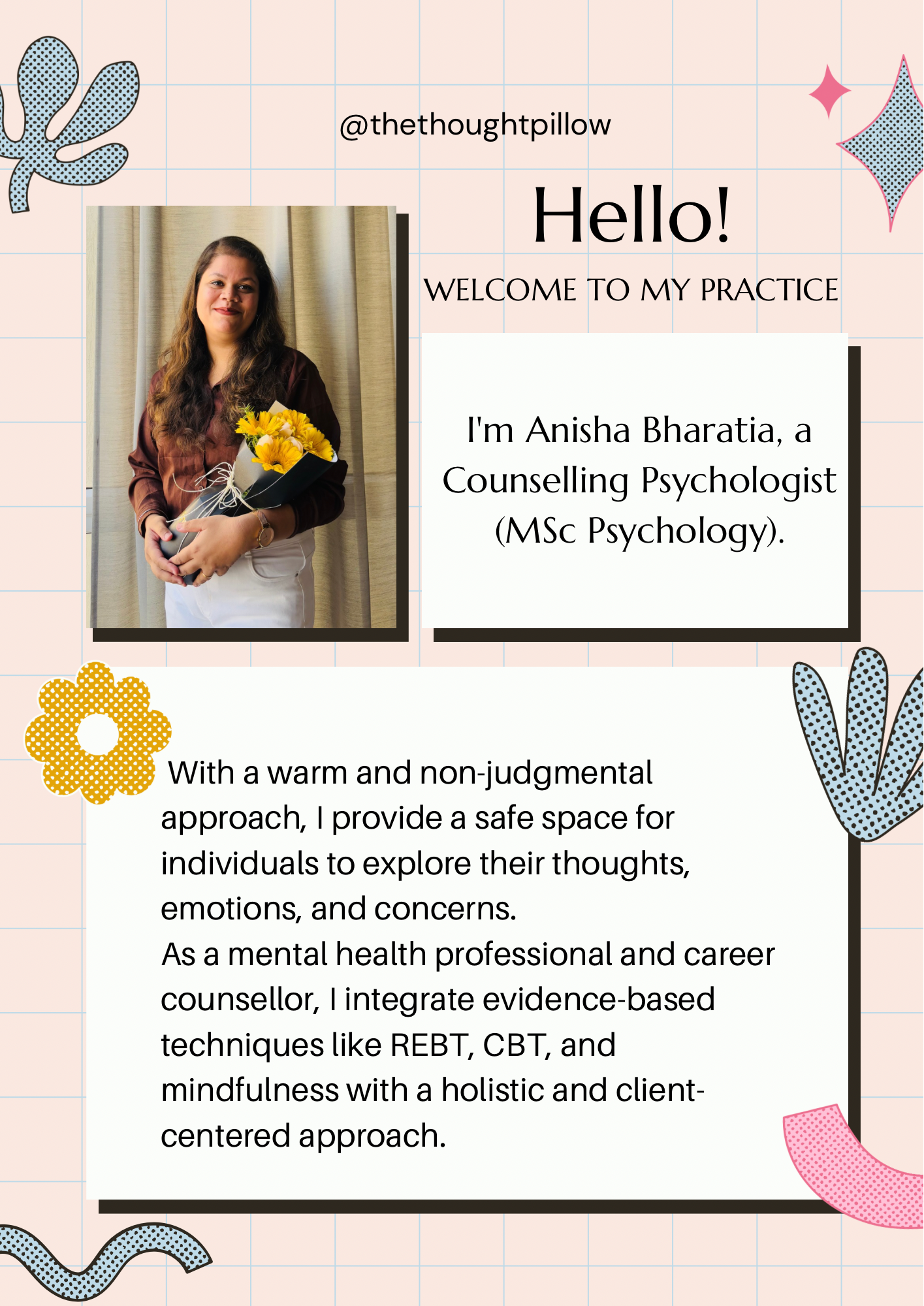 I'm Anisha Bharatia, a Psychologist, Art Therapist, and Educator with experience in educational and corporate settings. I offer expert counseling services and Employee Assistance Programs to diverse populations, leveraging evidence-based therapies like REBT, CBT, BT, Art Therapy, and mindfulness. With an MSc in Psychology from Mount Carmel College and a BA in Applied Psychology from The Assam Royal Global University, I'm a Certified Art Therapist and Career Counselor. I've received awards like being a Gold Medallist and Scholarship Holder. My approach is tailored to address each individual's unique needs.