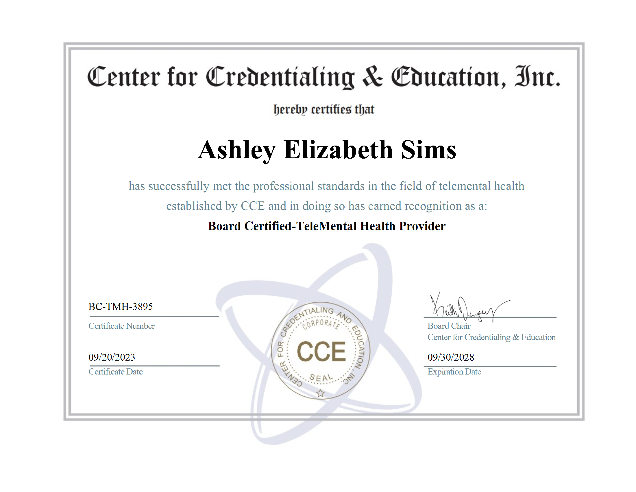 - Board Certified TeleMental Health Provider certificate since 2023