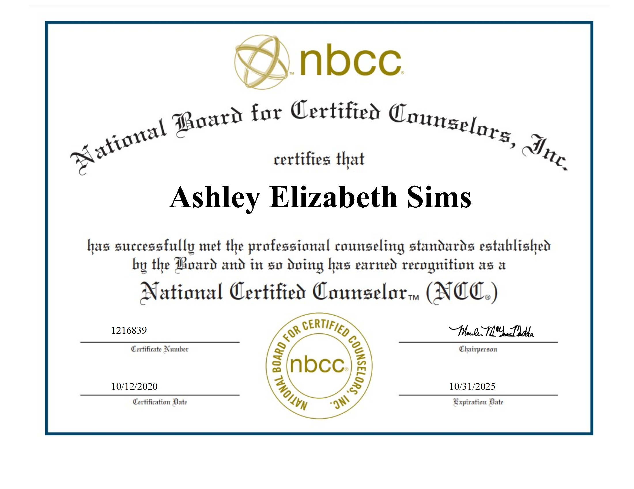 - National Certified Counselor certificate since 2020