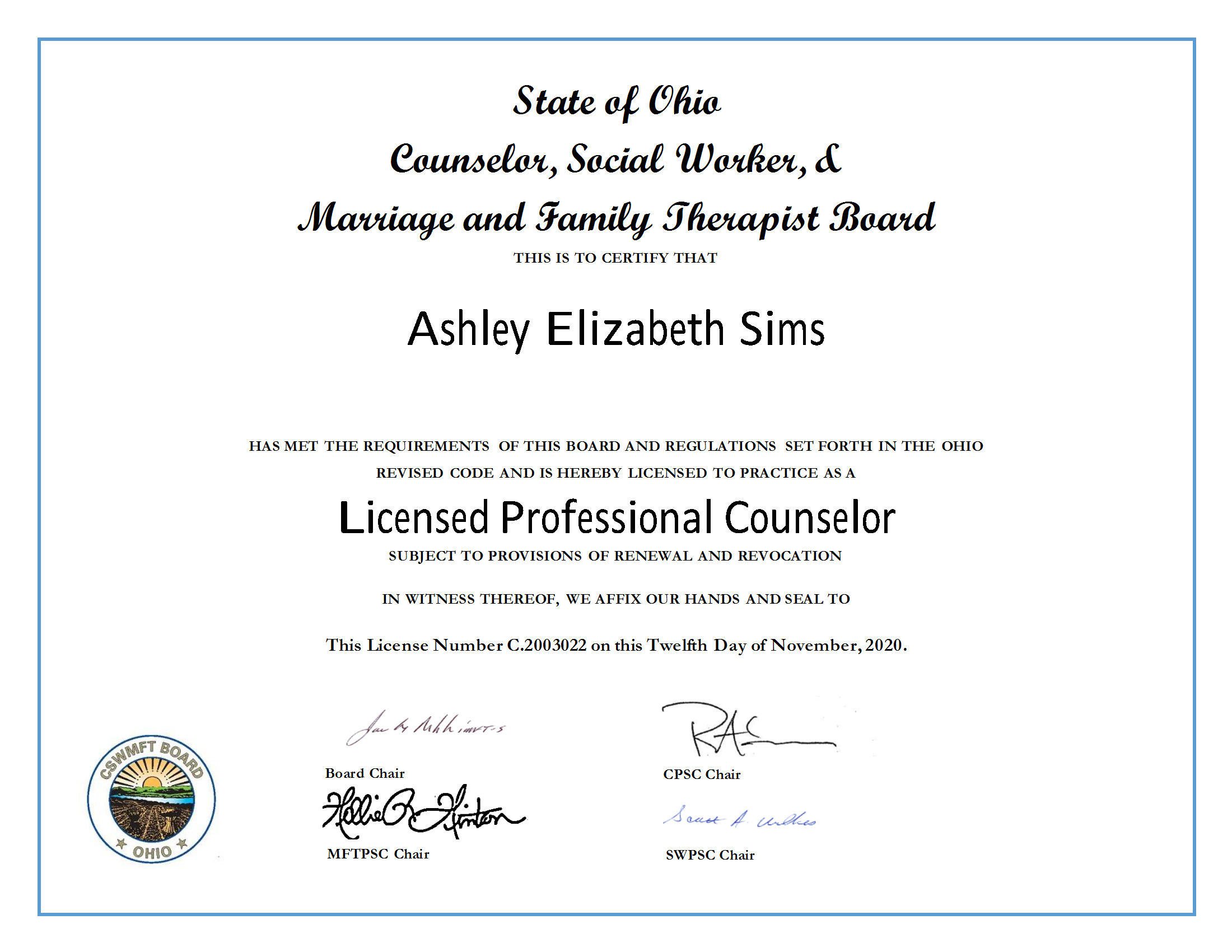 - Licensed Professional Counselor certificate since 2020