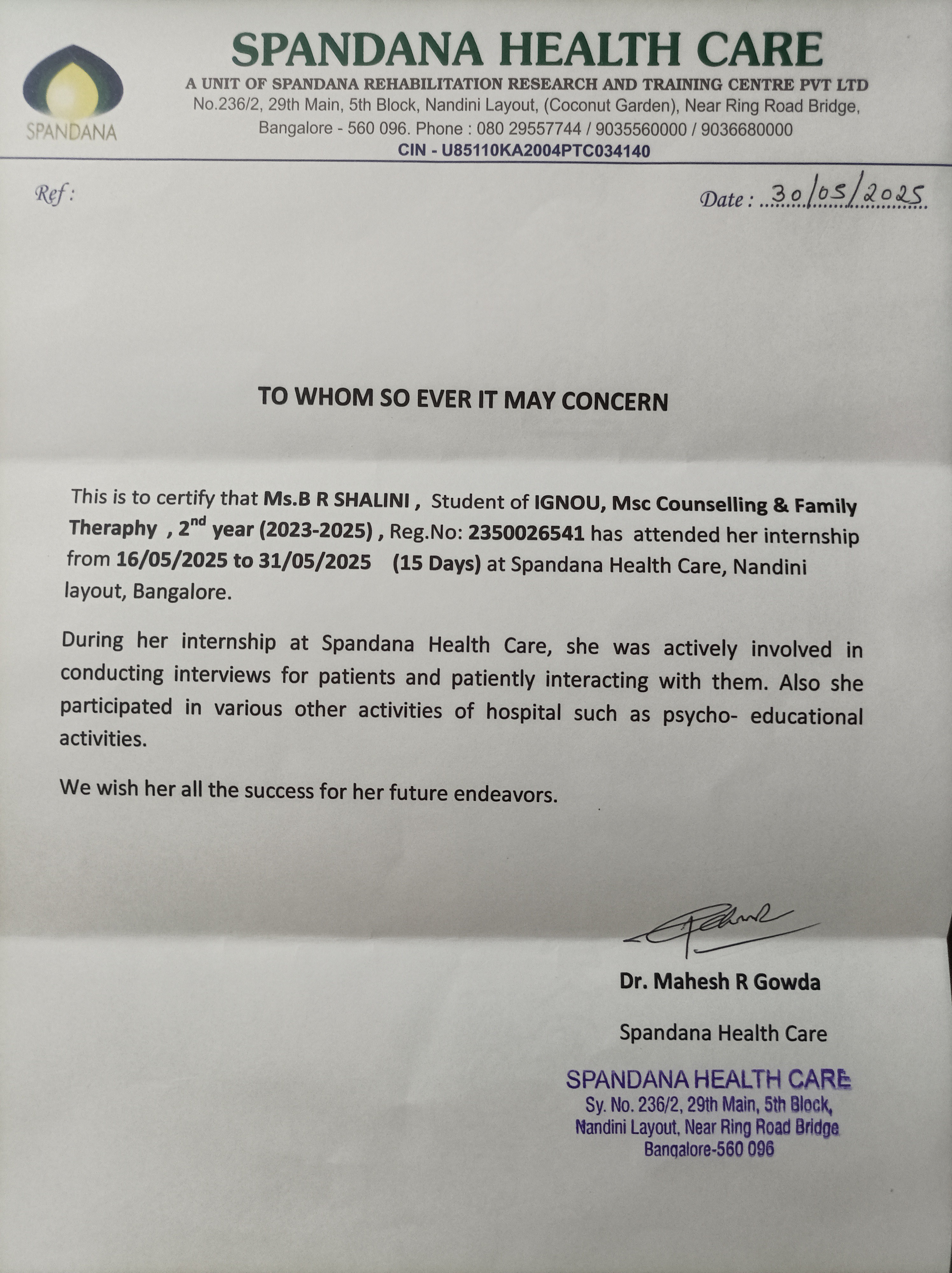 Has also completed area time 15 day Internship program at Spandana Healthcare as mandated in the MSc program