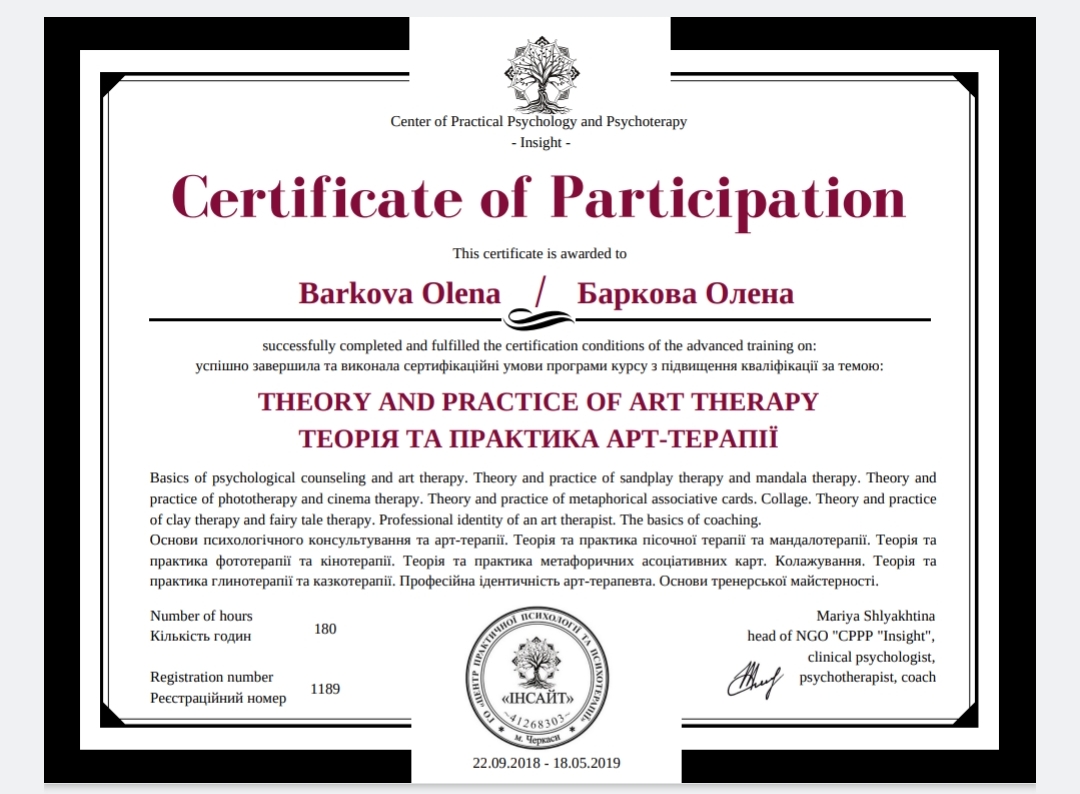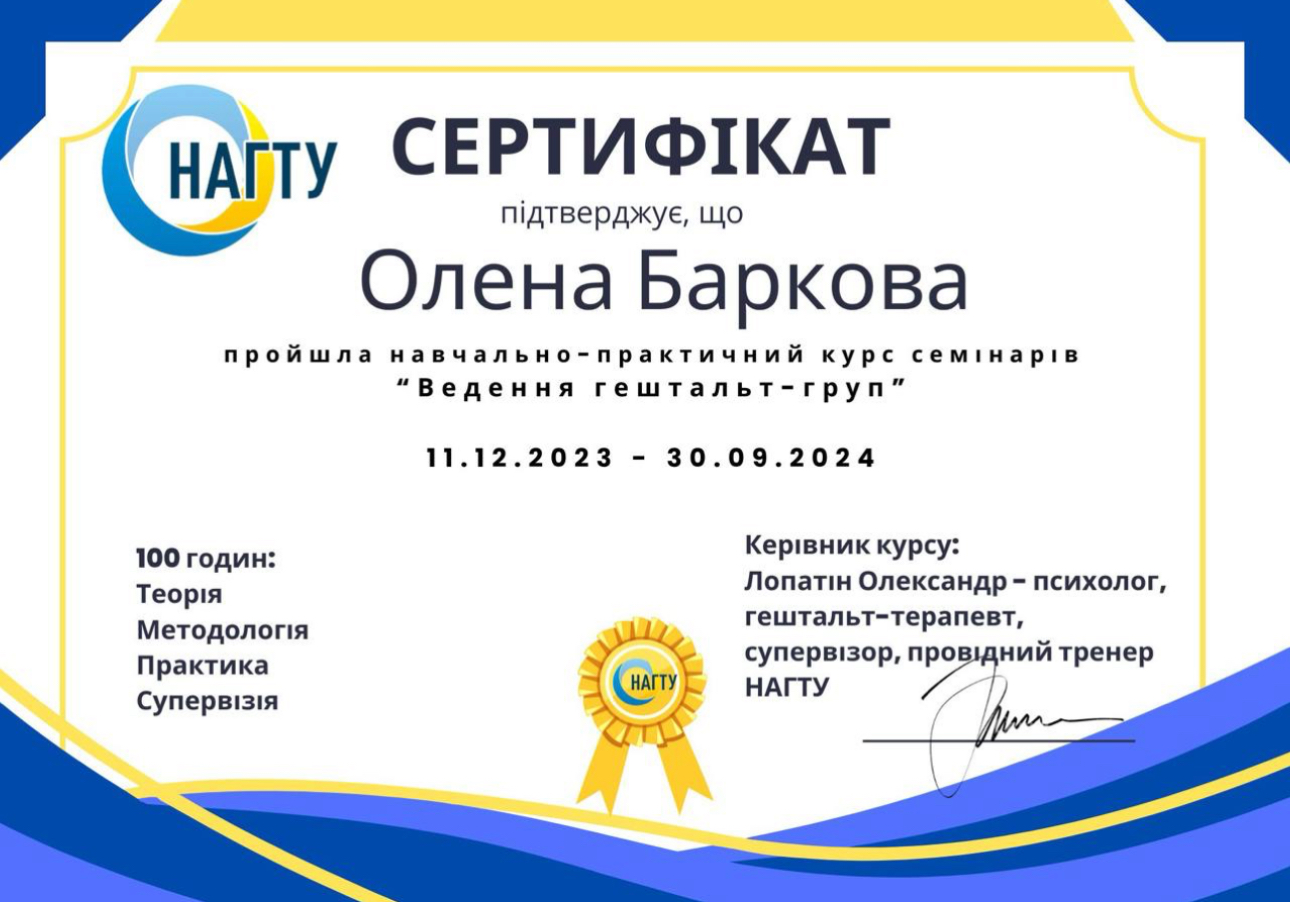 - XVII All-Ukrainian Gestalt Conference certificate since 2021