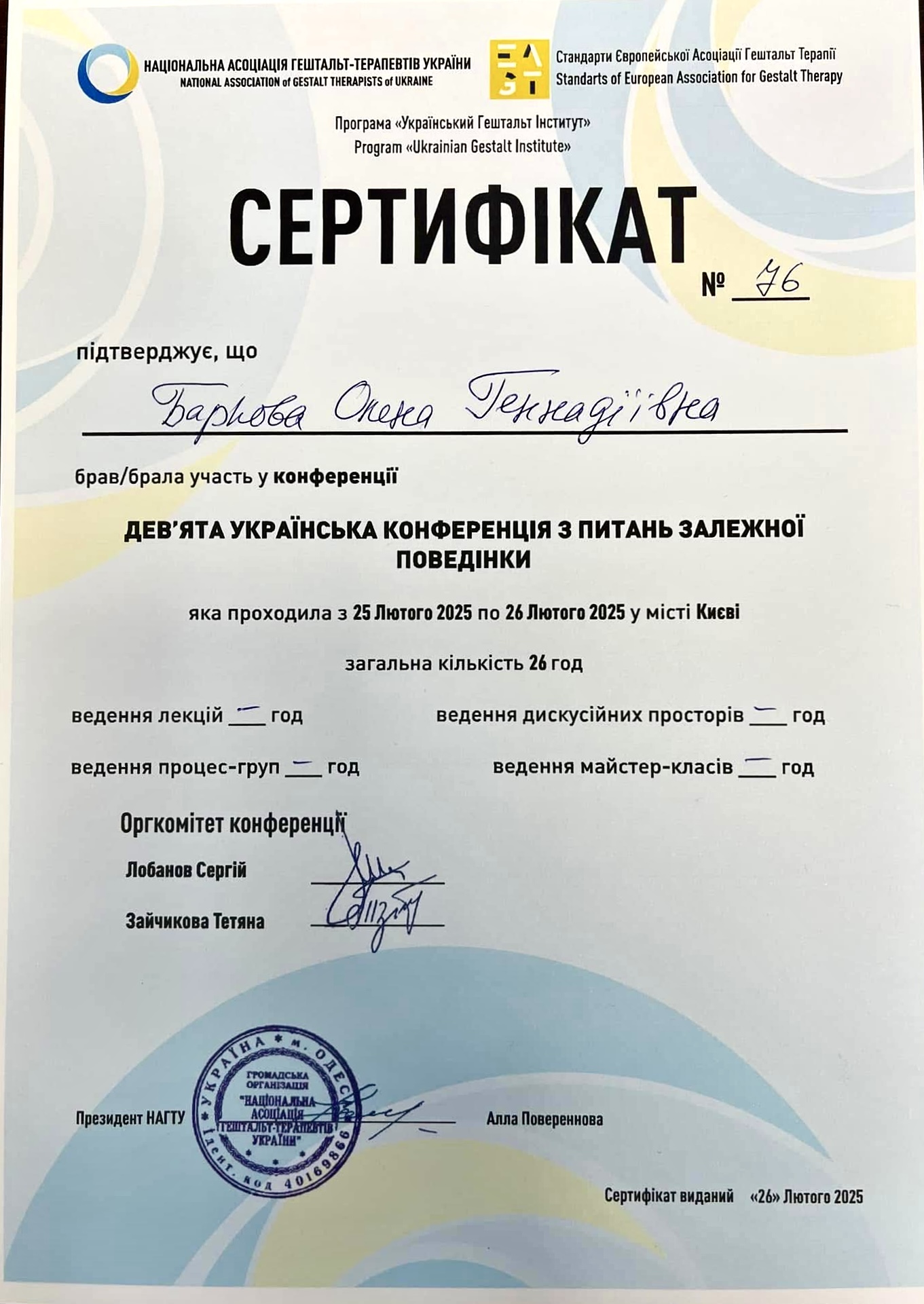 - Ninth Ukrainian Gestalt Conference on Addictive Behavior certificate since 2025