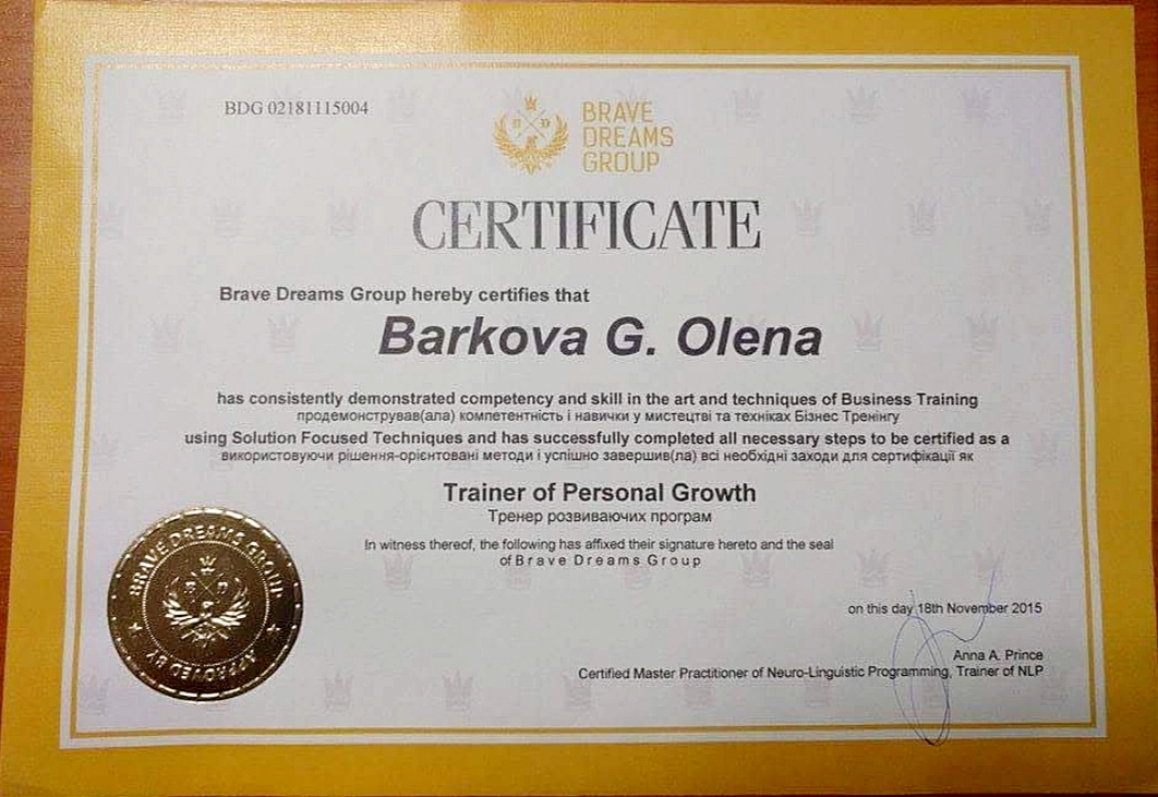 - NLP Coaching Course (NLP and Developmental Programs Coach) certificate since 2015