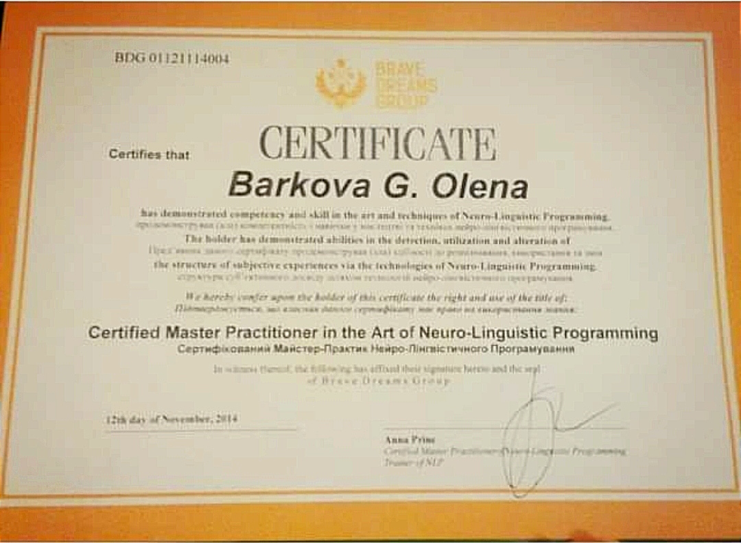 - NLP Master Course (NLP Master/Practitioner) certificate since 2014
