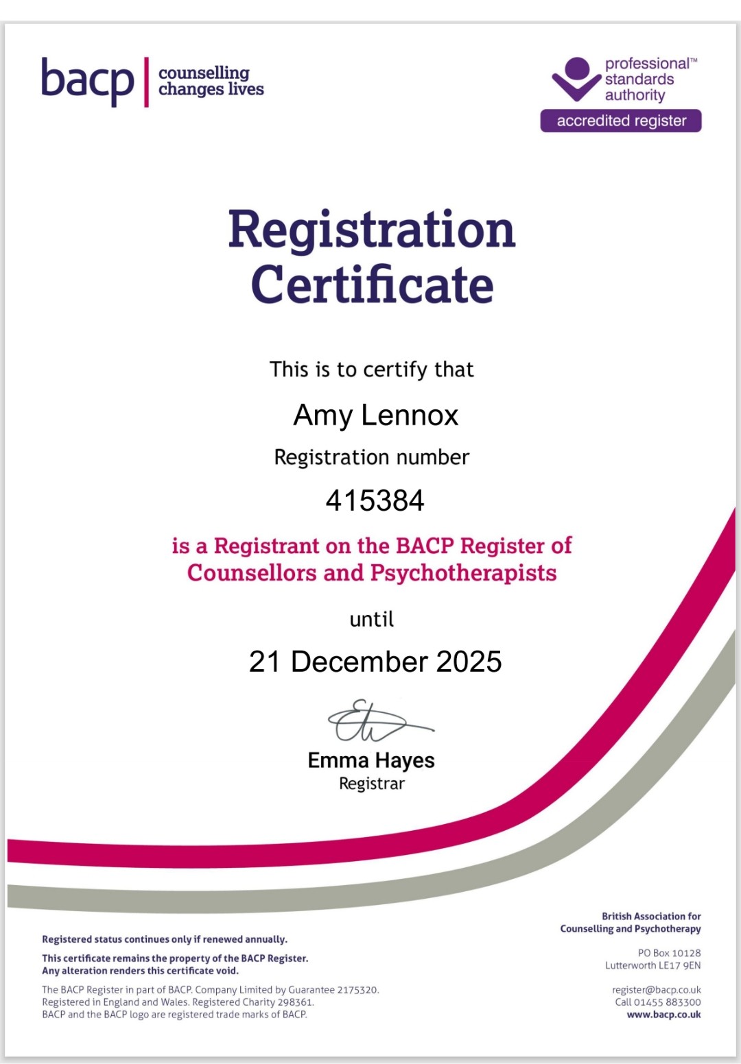 Hi I'm Amy. I work as a counsellor in private practice and have extensive experience of counselling people with situations they face in life. I am a member of the BACP and have a level 4 diploma integrative counselling and am currently studying for level 4 diploma for children's and young people counselling.