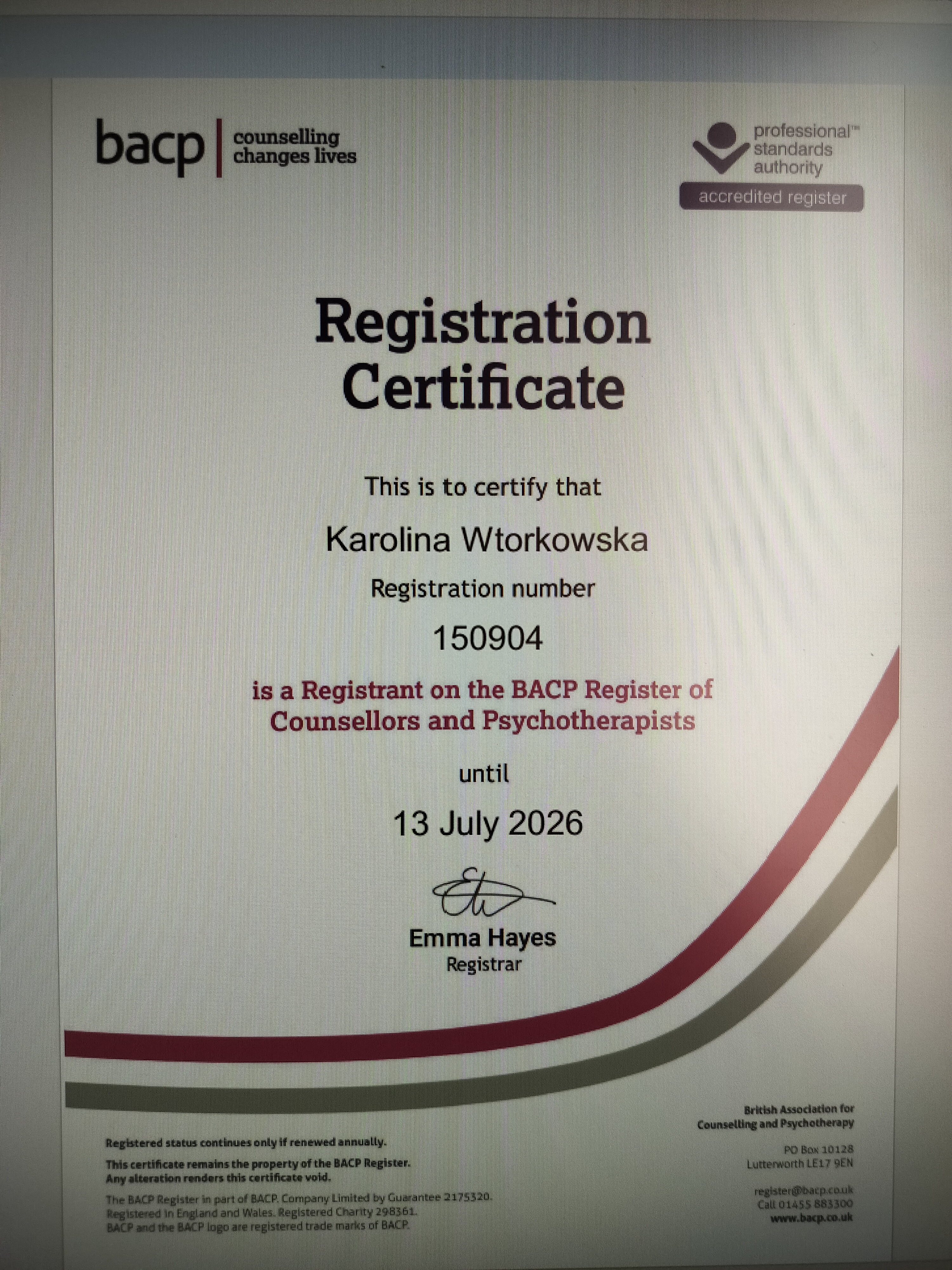 In addition, I have completed a Postgraduate Certificate in Clinical Supervision at the University of Derby and trained in Cognitive Analytic Therapy (CAT), which combines elements of cognitive behavioural therapy (CBT) and psychoanalysis. I am an accredited member of the British Association for Counselling and Psychotherapy (BACP) and work with both private and insurance clients, including Bupa, AXA, Aviva, Vitality, Bupa Global, and Healix.