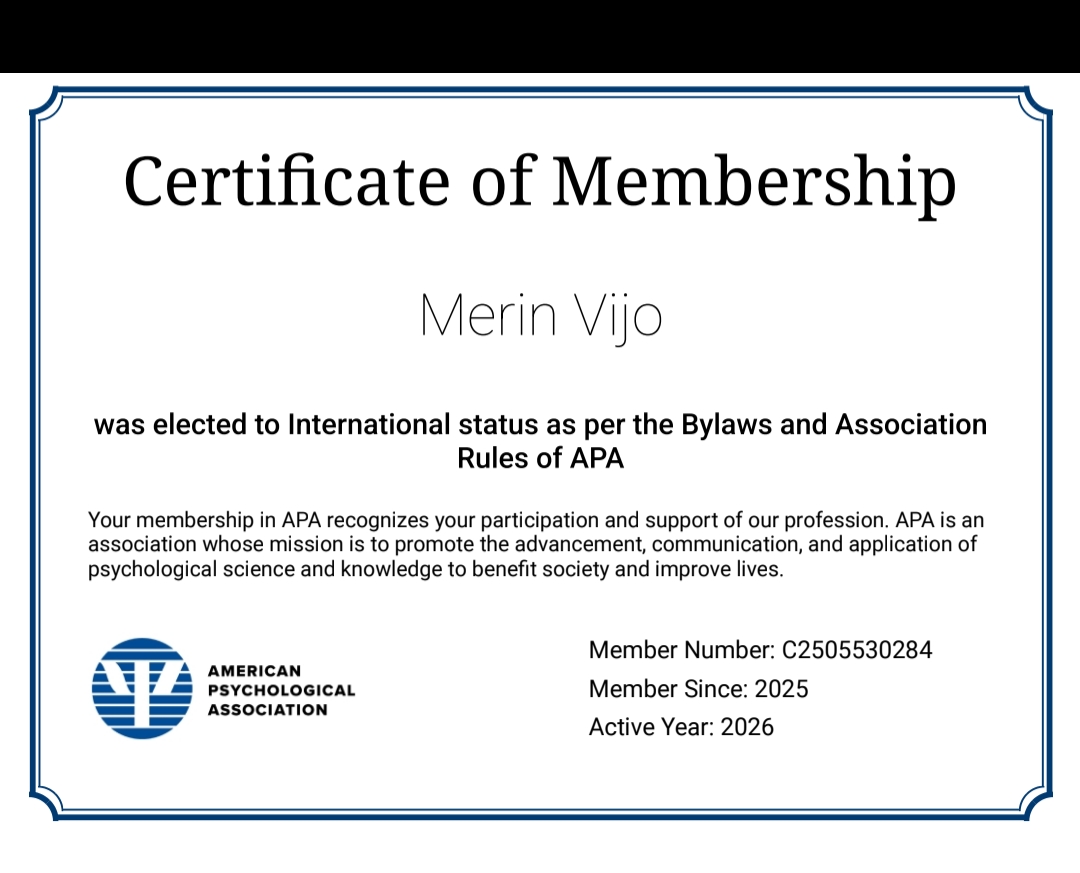 Psychological Disorders. Currently , I am working as School inclusive facilitator, counselor and sound therapist at Renyou Reflection Centre, Bangalore, Karnataka, India. I have attained certified coach titles on"Psychological Counselor, Parent and school -child counselor and emotional turbulence coach " from National Healthcare training academy, singapore. Moreover, I have individual membership in both NAPSWI and American Psychological Association.