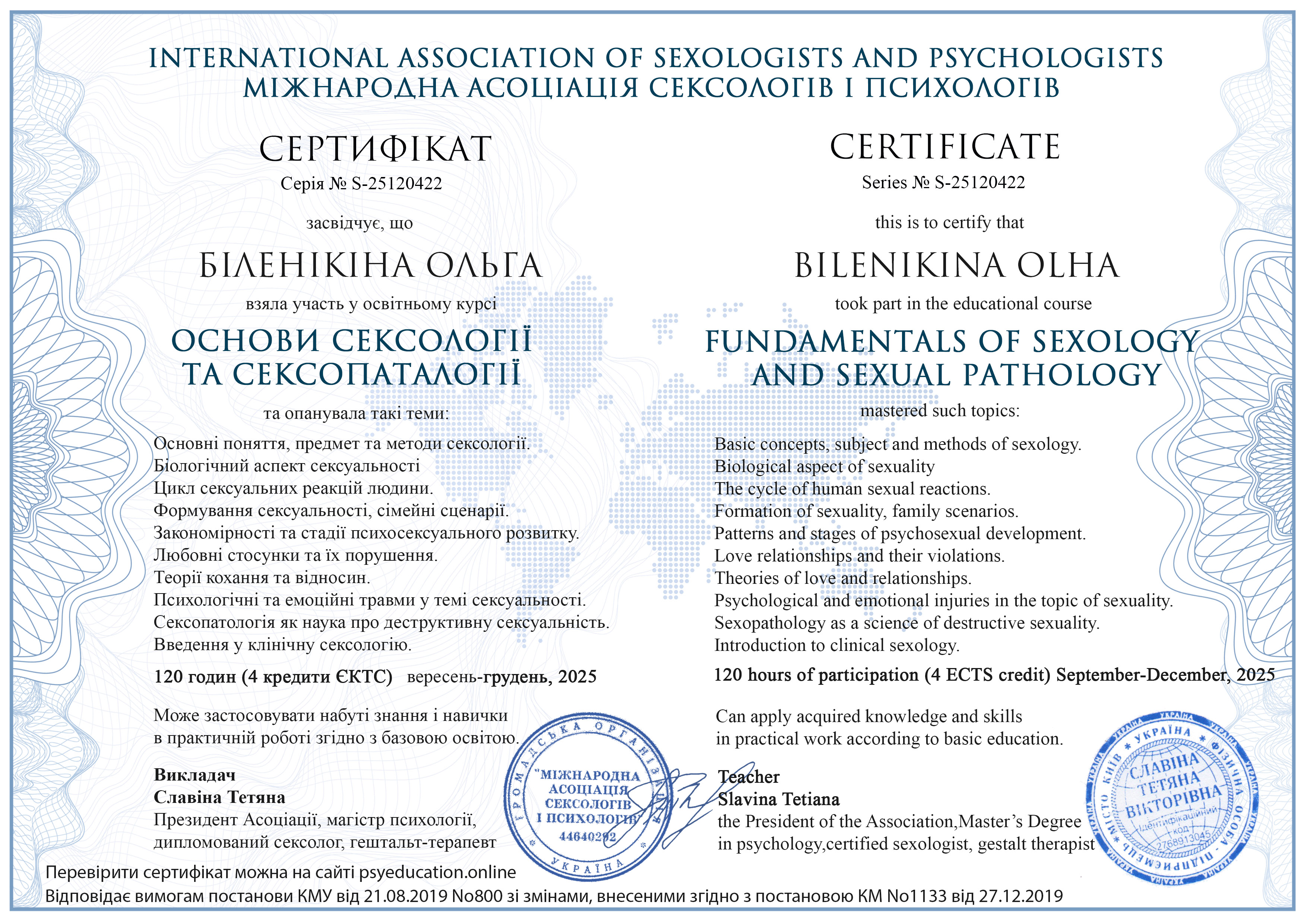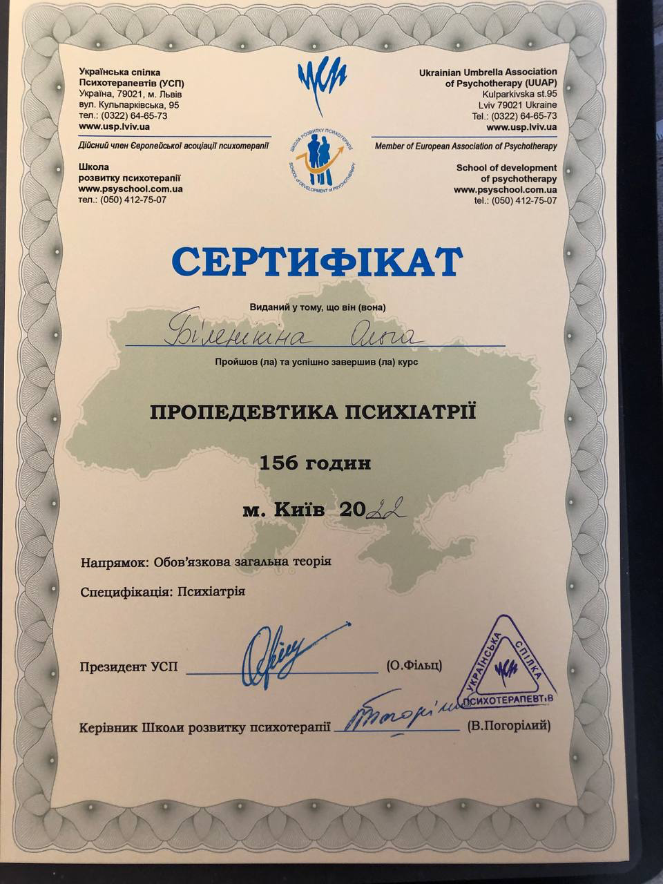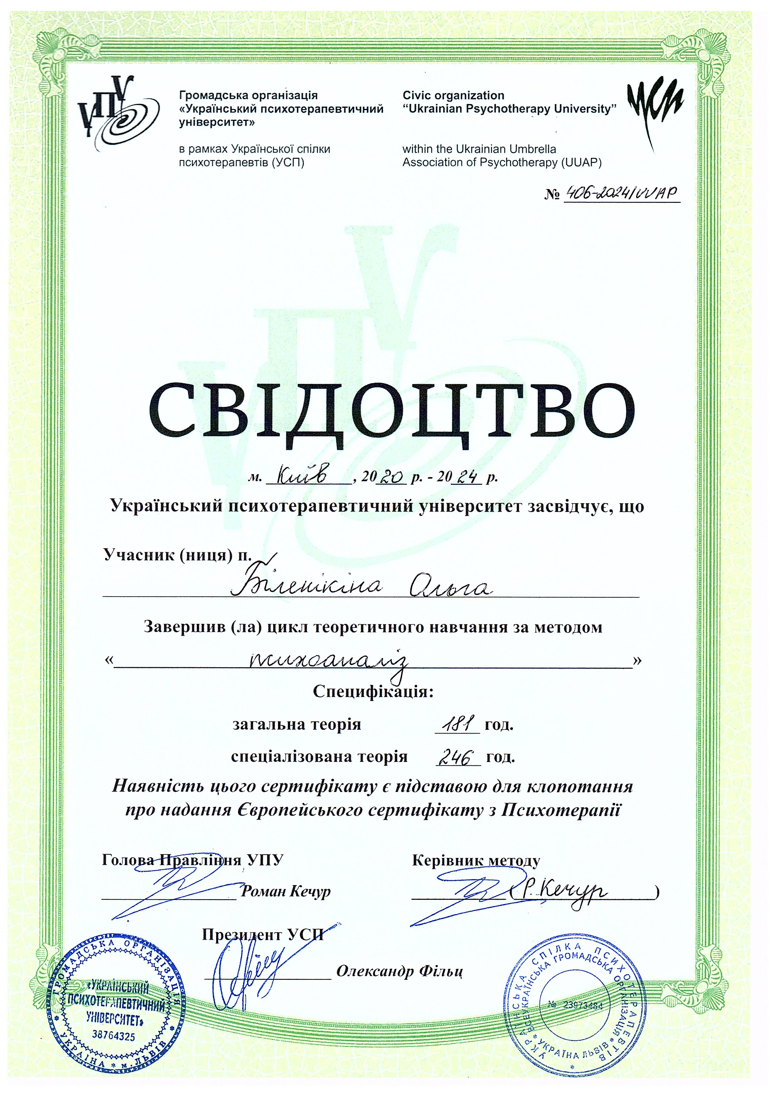 - Ukrainian Psychotherapeutic University Specialty: Psychoanalysis certificate since 2024