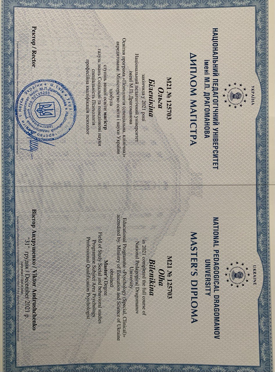 - Drahomanov National Pedagogical University Master's Degree Specialty: Clinical psycholog certificate since 2021