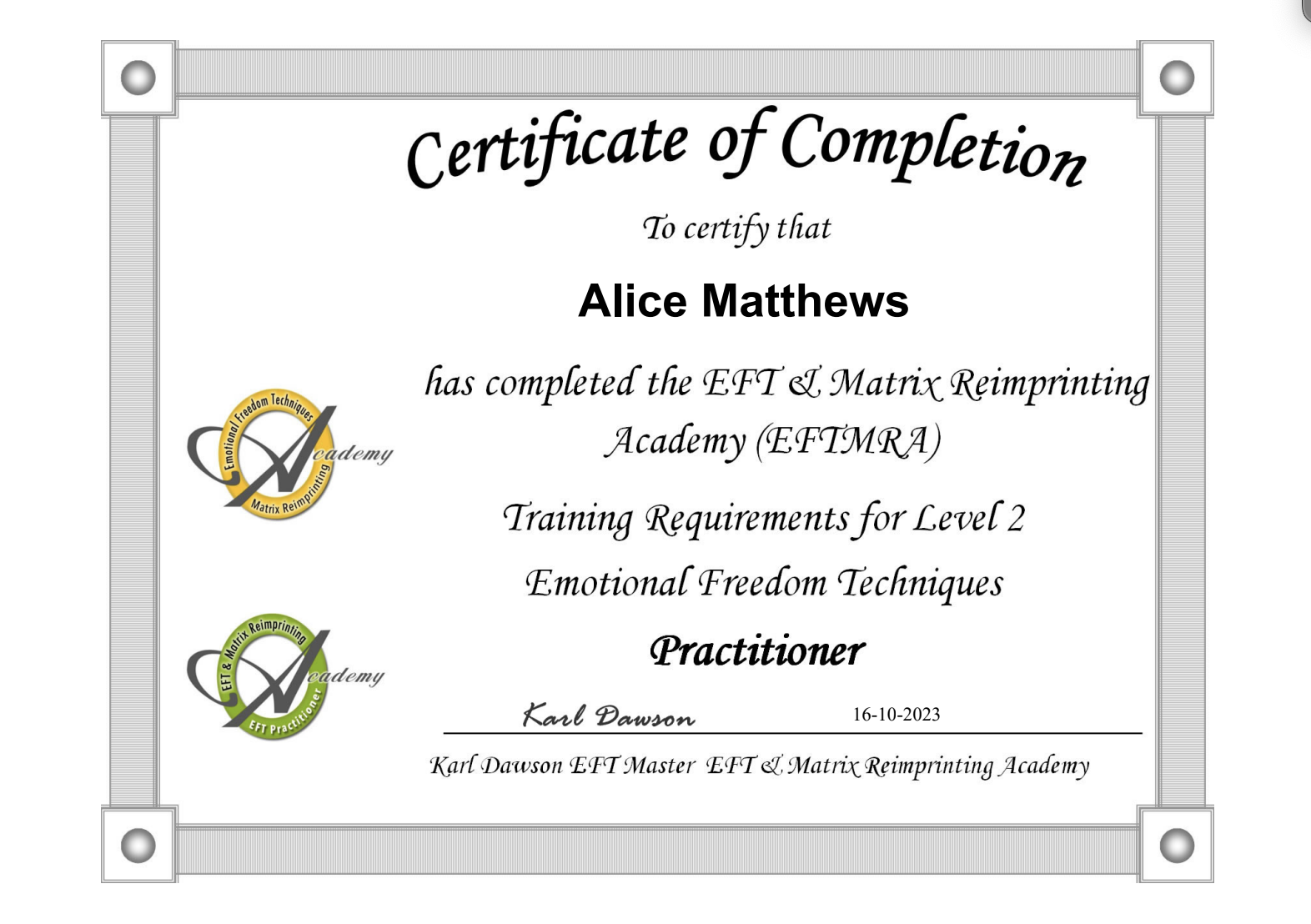 - EFT Matrix Reimprinting Academy (EFTMRA) certificate since 2023