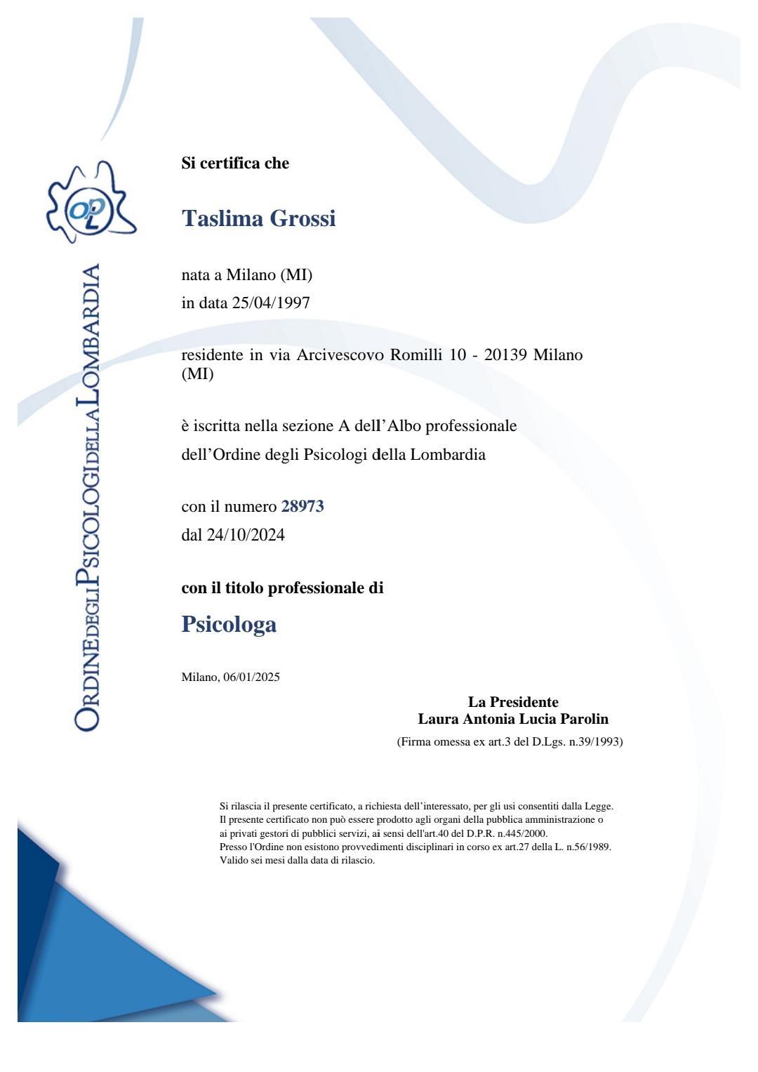 I obtained my degree in Clinical Psychology from Sigmund Freud University in Milan, which also included study periods at Sigmund Freud University in Vienna. I completed my post-graduate internship at Casa di Reclusione di Opera, Casa Circondariale S. Vittore, and the Istituto Penale per Minorenni C. Beccaria.