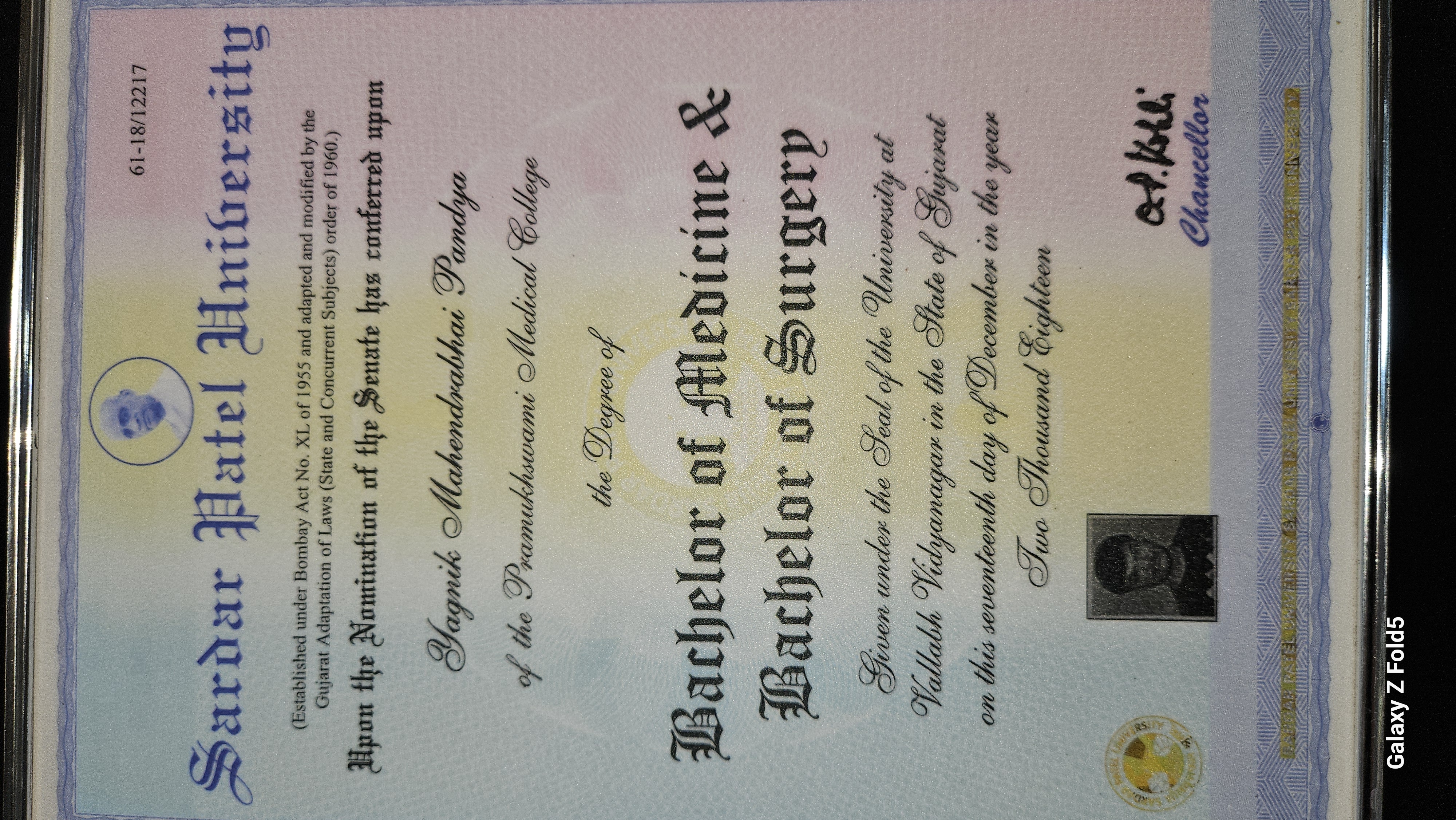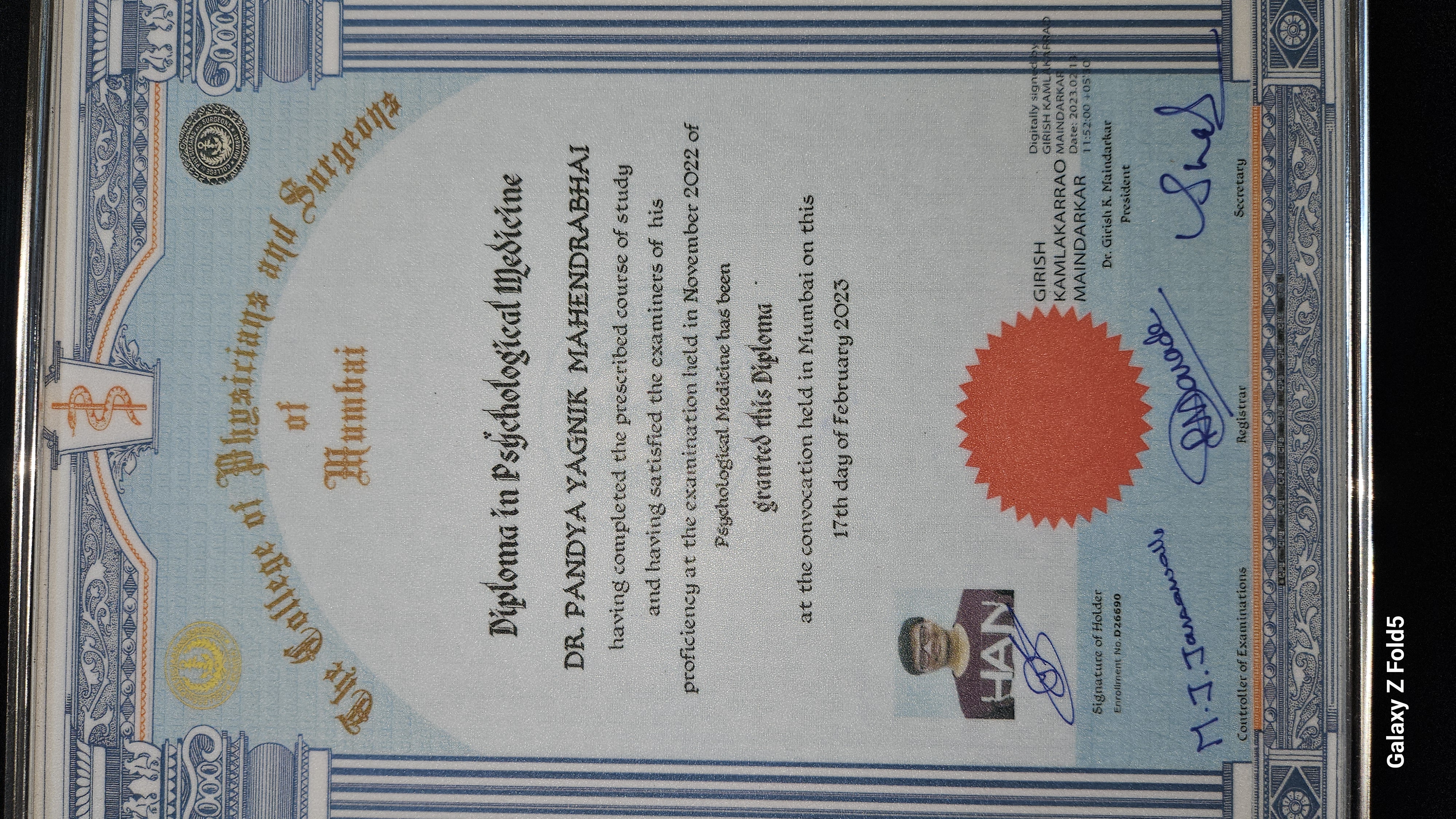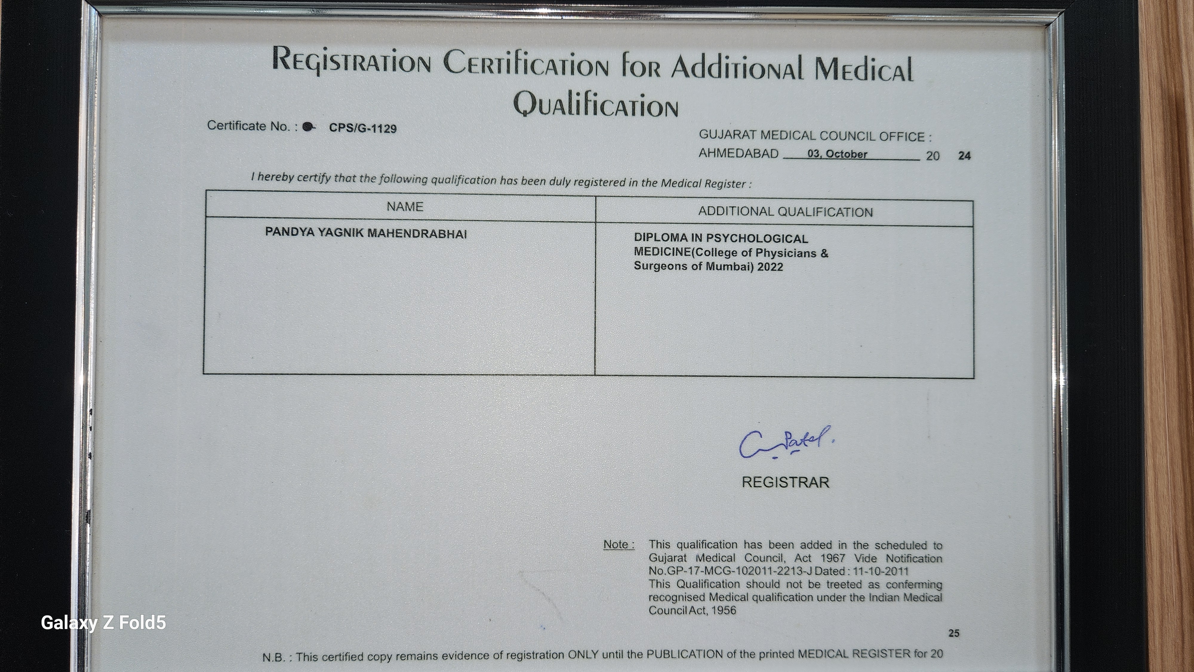 I am Dr.Yagnik M Pandya, i completed my undergraduate medical degree MBBS in india in 2018 with 1 year compulsory rotating internship. I worked as a medical officer at community healthcare center. I completed my post graduate diploma in psychiatry in 2023 with a gold medal. I have worked as a consultant psychiatrist and research rater as well as subinvestigator in national and international trials at Divyam Psychiatric institute from 2023 till 2025. Currently i have started my own private practisw with 5 years of experience in field of psychiatry amd 3 years as a consultant psychiatrist.