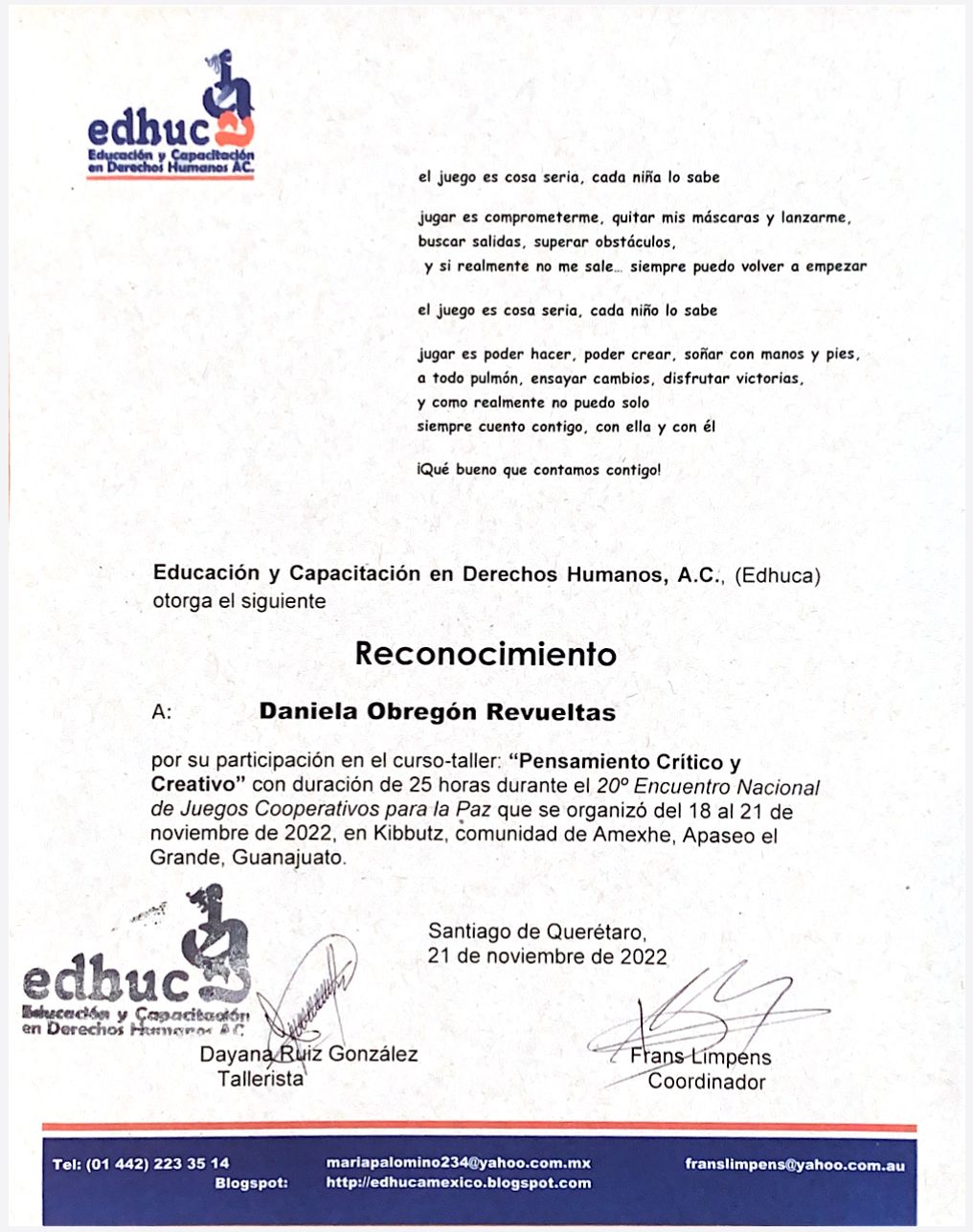 - Certificado Manejo no violento de conflictos por Edhuca desde 2022