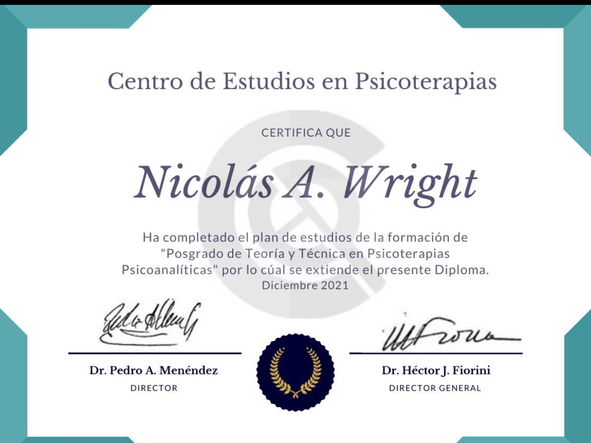Me recibí en la Universidad de Buenos Aires en el 2005 y luego comencé mi formación con el Dr Fiorini para unos años más tarde pertenecer al Int. Angel Garma en la Asociación Psicoanalítica Argentina. Donde actualmente me encuentro en constante formación y supervisión.