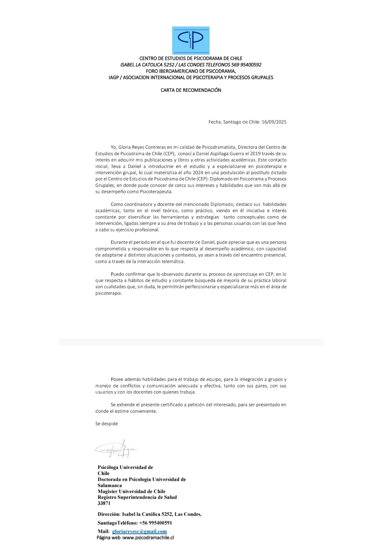 Poseo diplomado en Clínica Moreniana, certificación de más de 500 horas clínicas, supervisión continua y recomendaciones clínicas y académicas disponibles, incluyendo recomendación profesional en salud pública y recomendación académica de Gloria Reyes Contreras, doctora en Psicología Humanista por la Universidad de Salamanca.