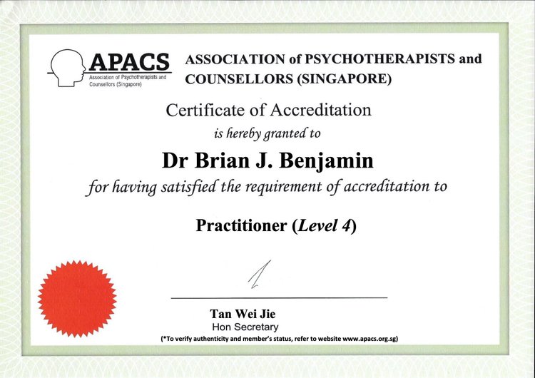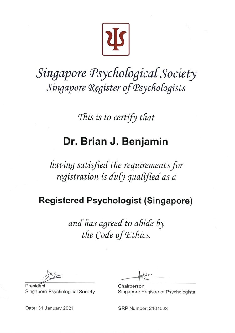 - Certificado Sociedad psicológica de Singapur Psicólogo registrado desde 2021