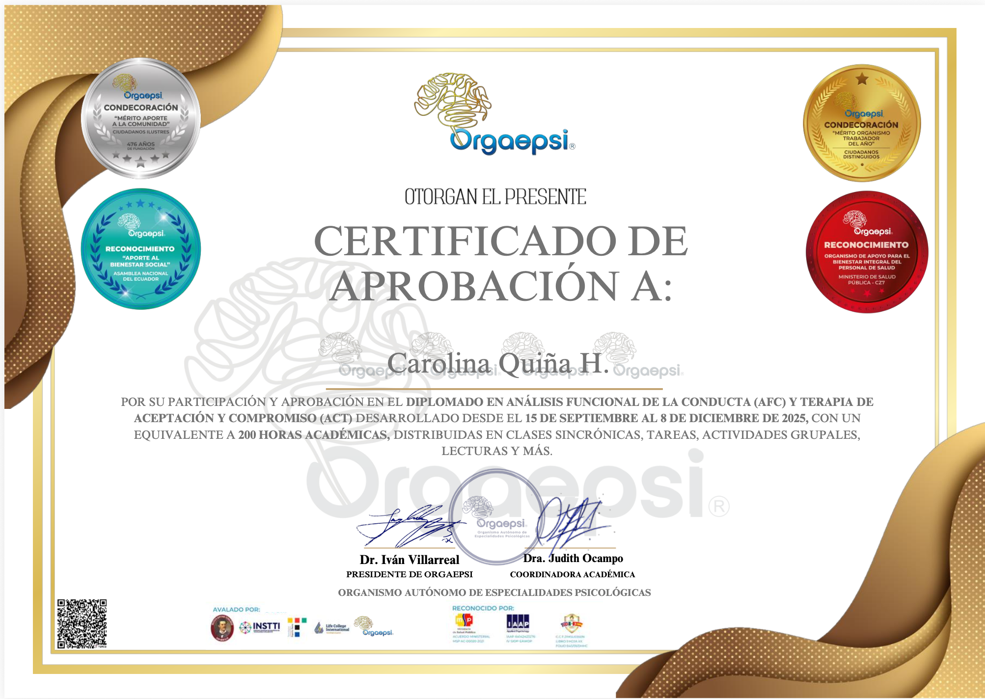 - Certificado Diplomado en Análisis Funcional de la Conducta (AFC) y Terapia de Aceptación y Compromiso (ACT) desde 2025