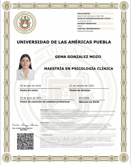 ¡Hola! Soy psicóloga clínica. Trabajo bajo el modelo de la terapia cognitivo conductual y la DBT, al ser enfoques basados en evidencias nuestras sesiones serán centradas en obtener soluciones, te proporcionaré estrategias y técnicas prácticas científicamente probadas para abordar con eficacia tus problemas. Mi enfoque es totalmente personalizado y se adaptará a tus necesidades. Soy una psicóloga apasionada por las emociones que nos conectan y una firme creyente de que conocernos a nosotros mismos nos brindará una mejor relación con el mundo.