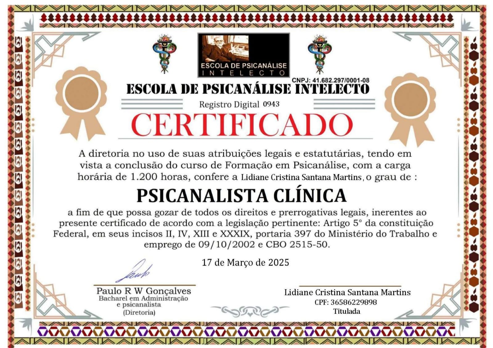 Prazer, meu nome é Lidiane Martins, sou formada em Psicanálise Clínica com conhecimento em depressão, ansiedade e autoestima, e cuidar da mente é o maior ato de amor a si mesmo, se autoconhecer muda a forma como vemos o mundo e as coisas, e entendemos comportamento que nos paralisa e quero te ajudar nesse processo. Estou te aguardando!