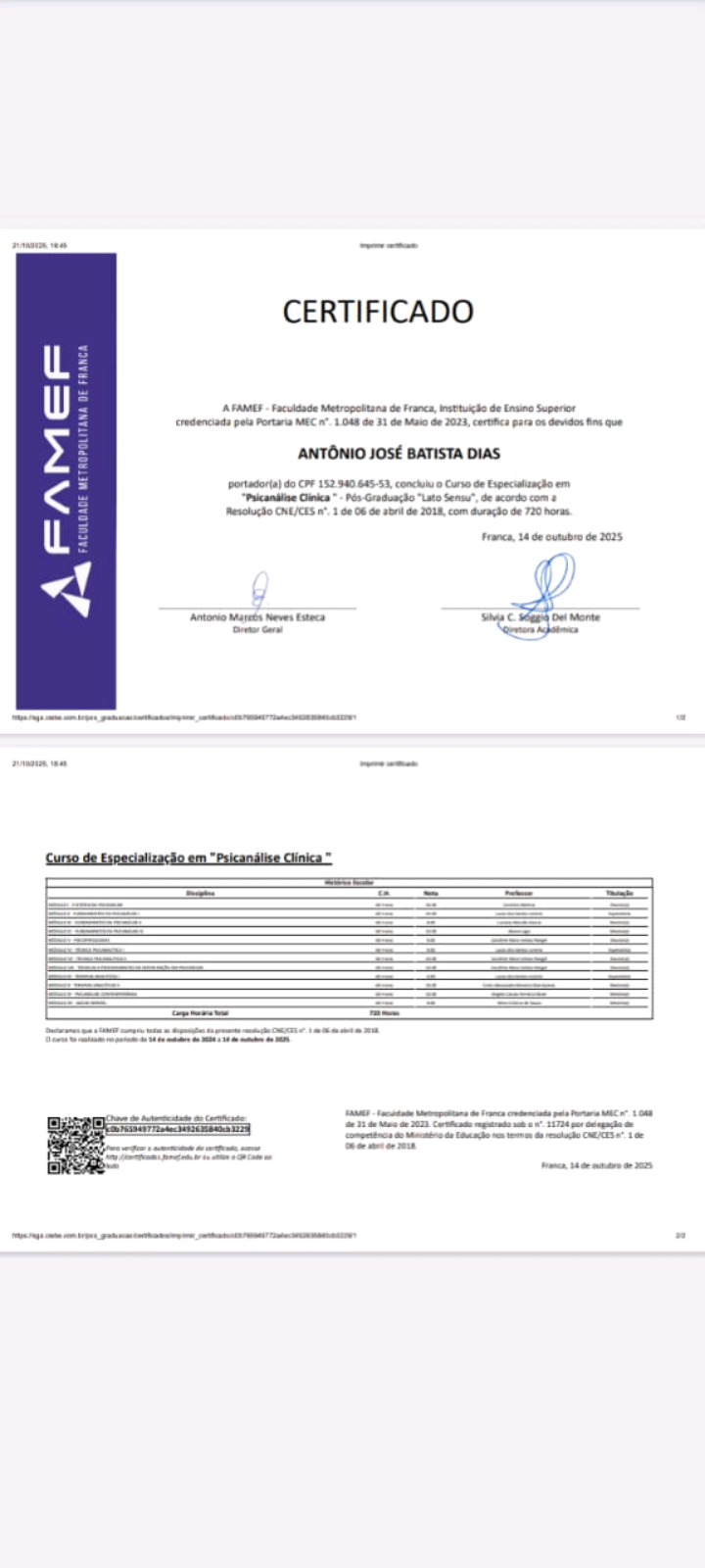 Meu nome é Antônio, sou formado em bacharel em Teologia, Licenciatura em História, Pós graduado em Teologia, mestre em Teologia, e Pós graduação em psicanalista Clínica. Atuo há muitos anos nessa área.