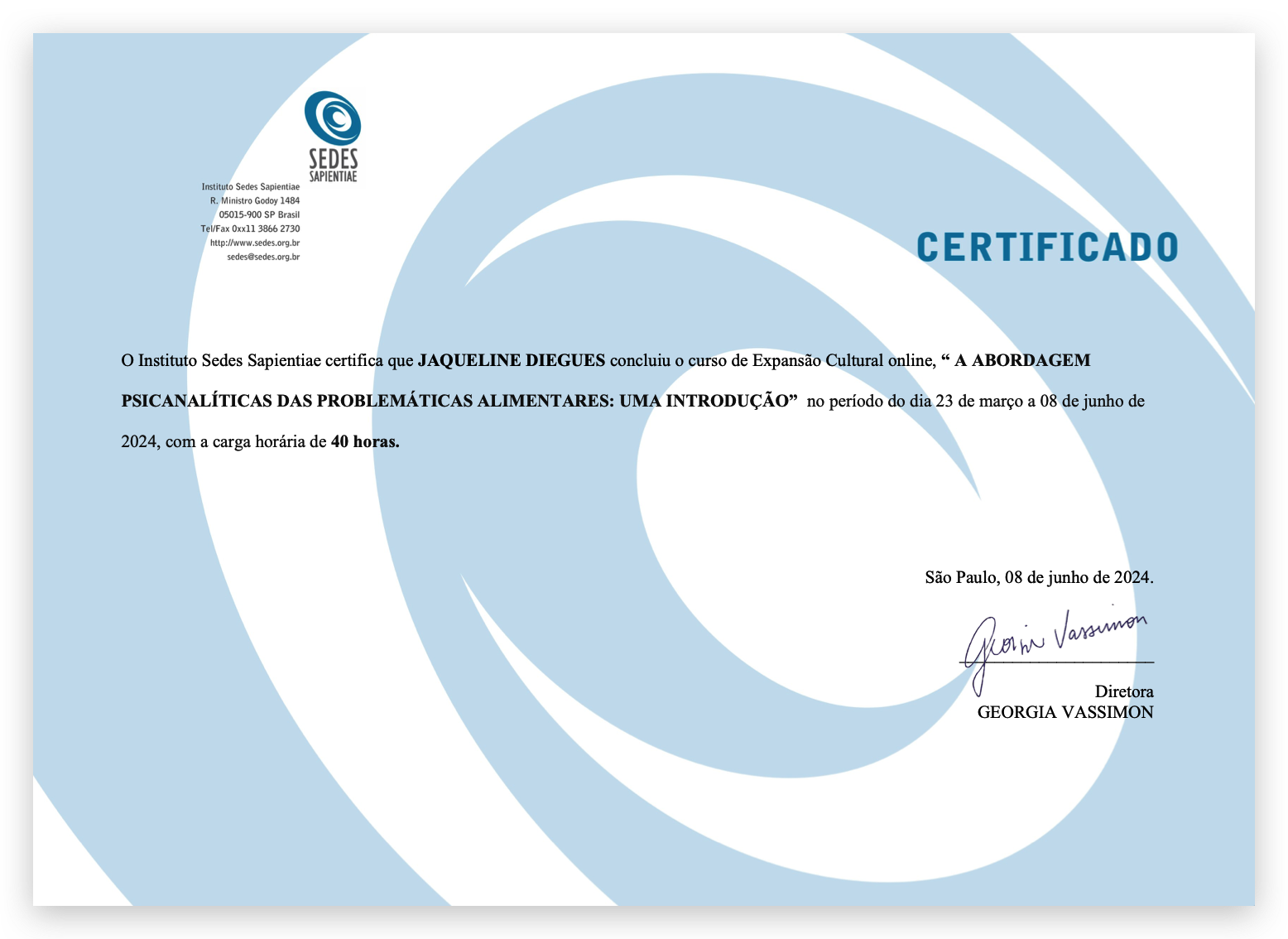 - Certificado Instituto Sedes Sapiantie - A Abordagem Psicanalítica das Problemáticas Alimentares desde 2024