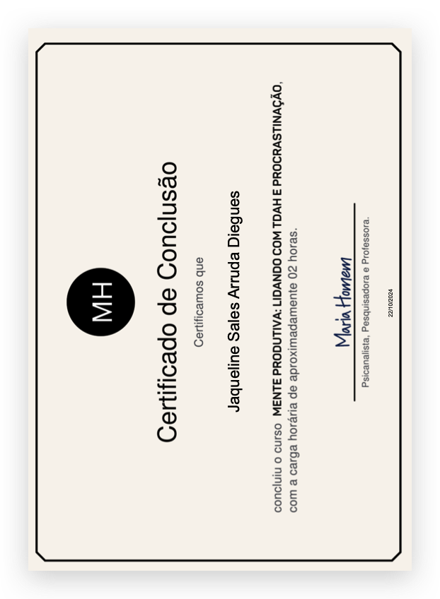 - Certificado Maria Homem - Lidando com TDHA e Procrastinação desde 2024
