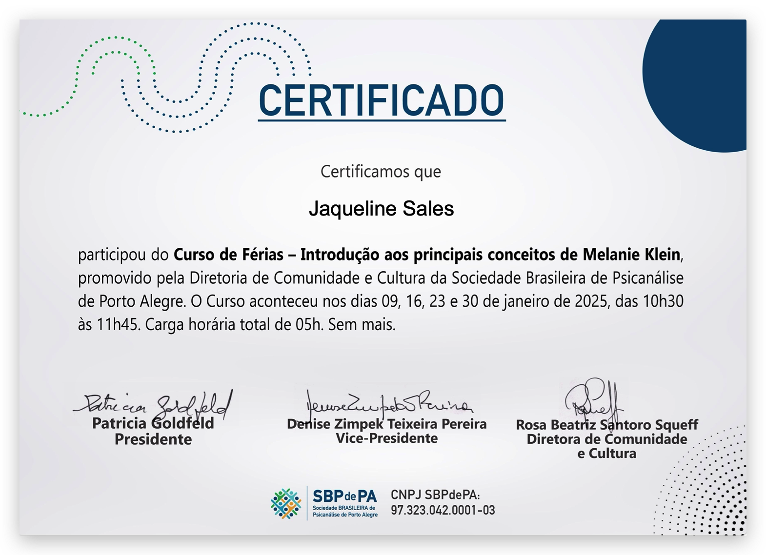 - Certificado Introdução aos principais Conceitos de Melanie Klein desde 2025
