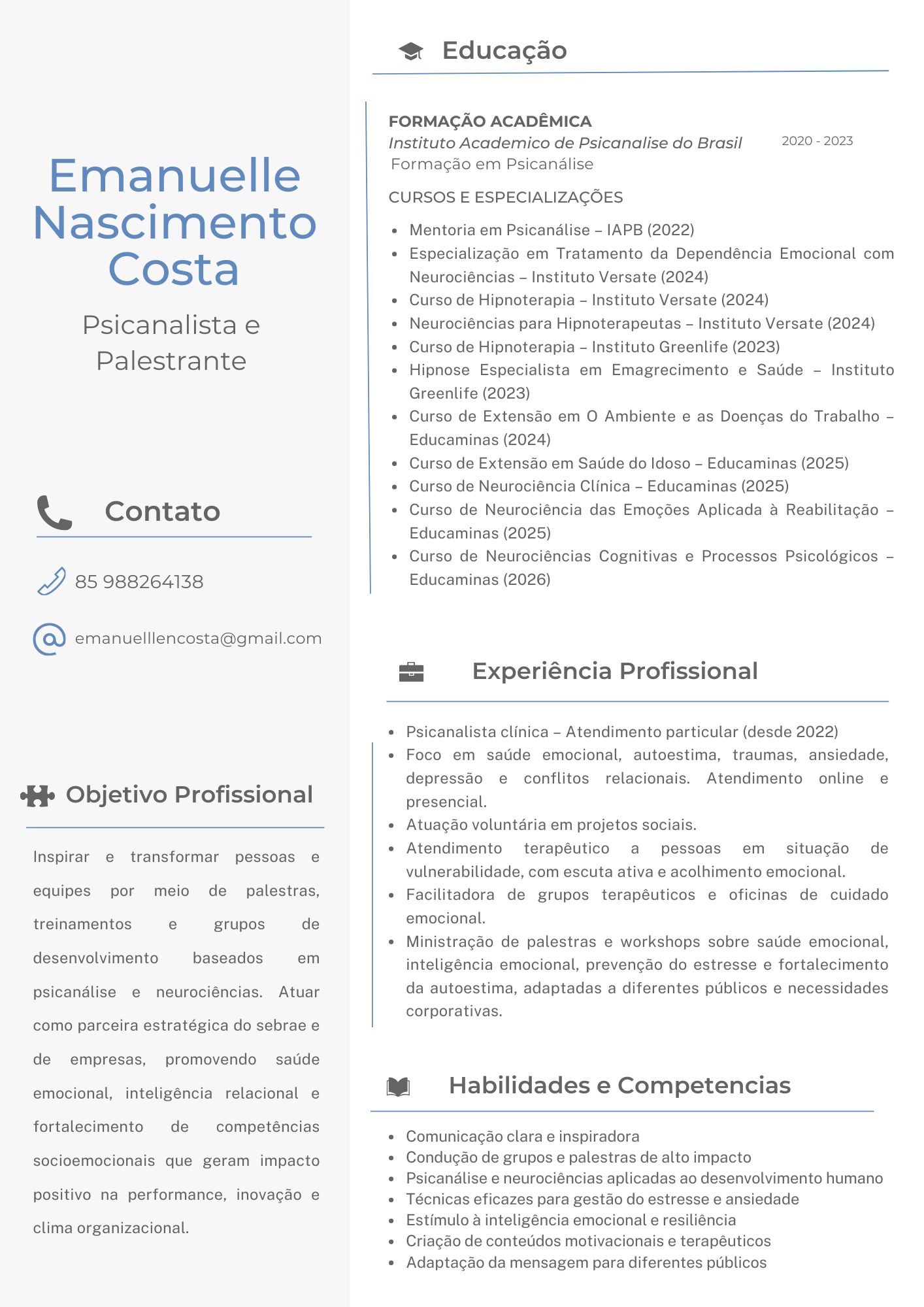 Sou psicanalista clínica, com formação em Psicanálise e especializações em Hipnoterapia e Neurociências das Emoções. Atuo com uma abordagem integrativa, que une escuta profunda, compreensão do inconsciente e técnicas terapêuticas baseadas em evidências científicas, respeitando a singularidade de cada pessoa.