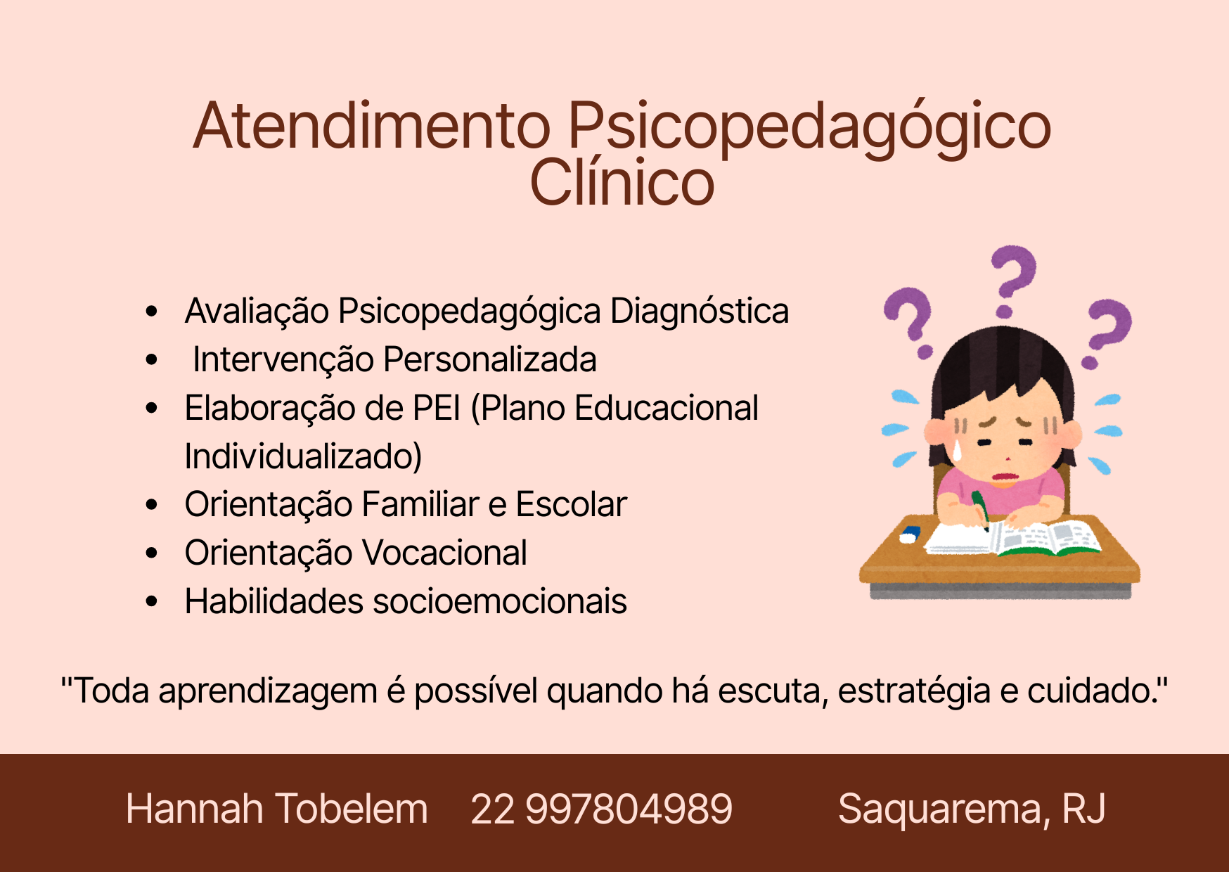 Psicopedagoga com formação em Ciências Biológicas e experiência em educação e desenvolvimento de jovens. Atuo com foco na aprendizagem significativa, nas competências socioemocionais e na orientação para inserção no mundo do trabalho. Minha prática integra escuta qualificada, acolhimento e estratégias pedagógicas personalizadas, buscando apoiar estudantes em suas dificuldades de aprendizagem e no fortalecimento da autonomia, organização e projeto de vida.