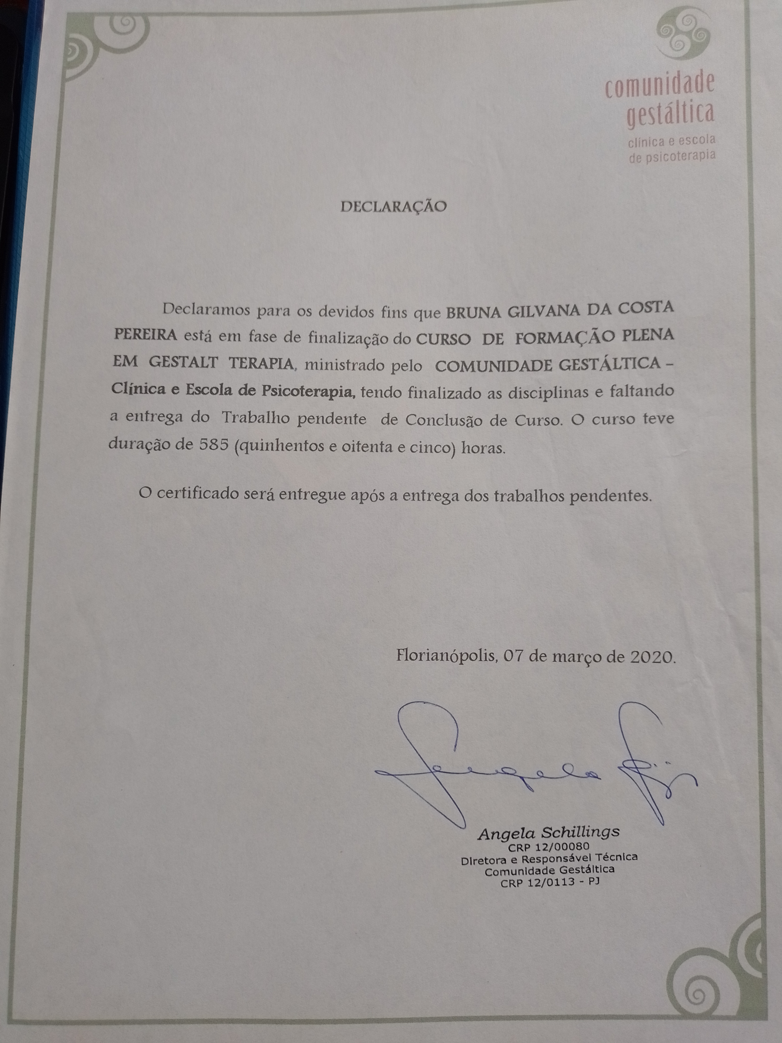 - Certificado Declaração Formação Plena em Gestalt terapia desde 2020