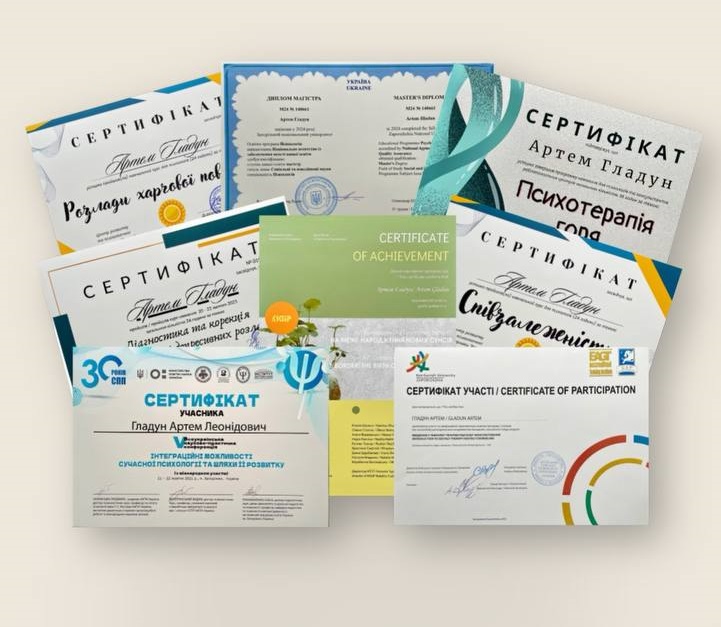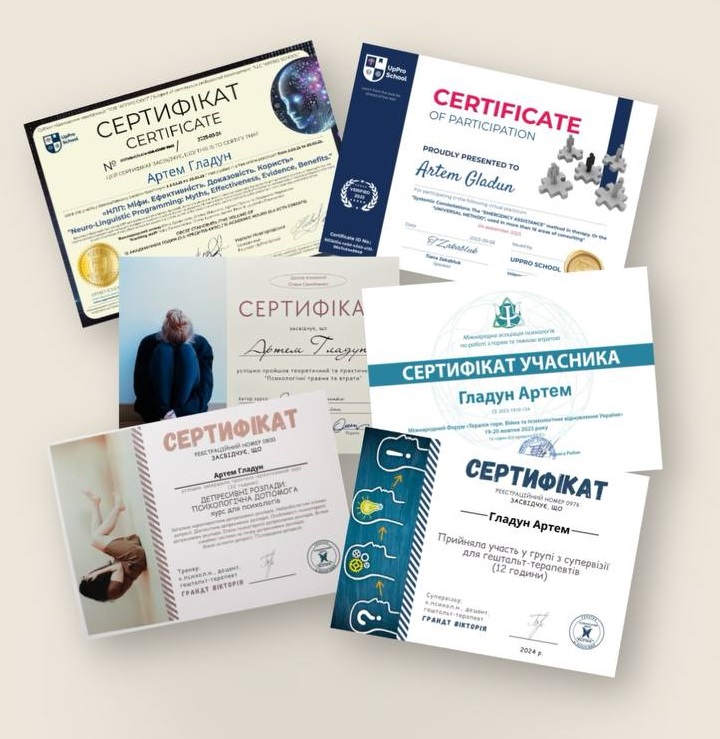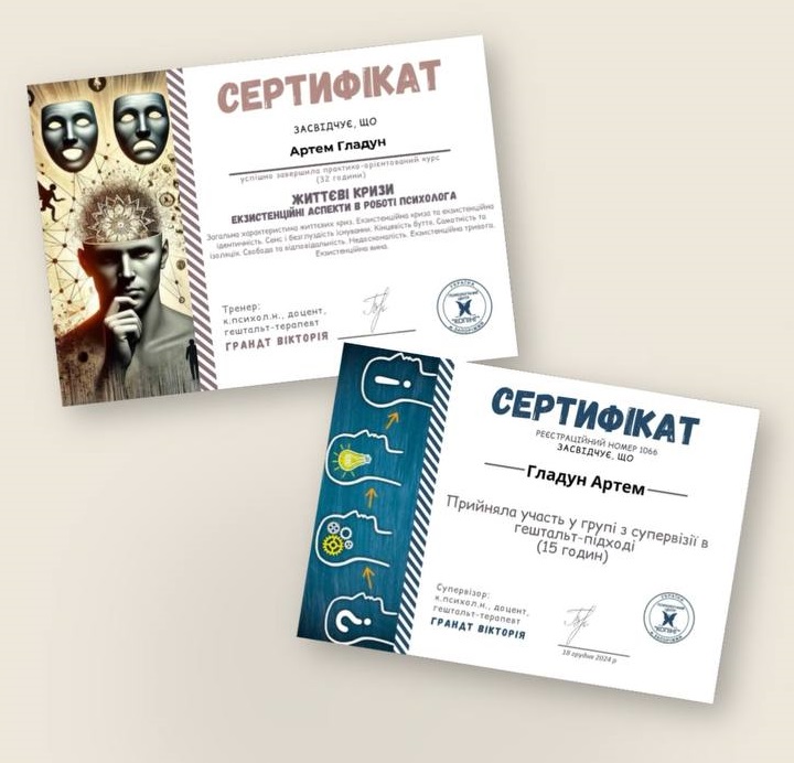 - Сертификат Гештальт-терапия. 1 степень с 2021 года