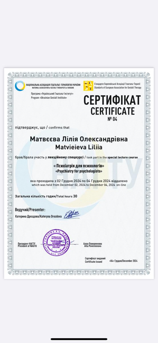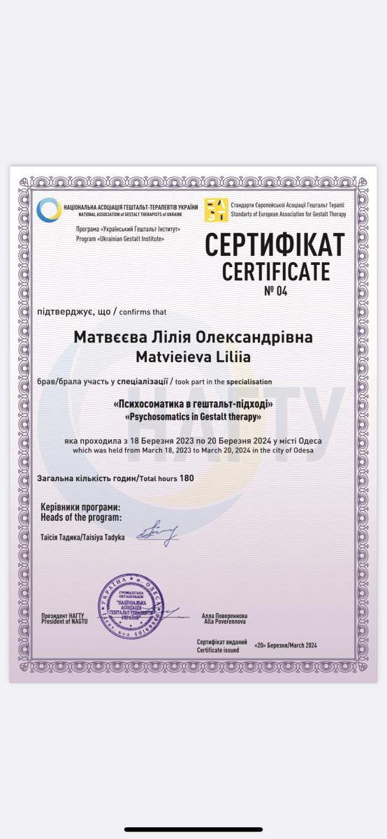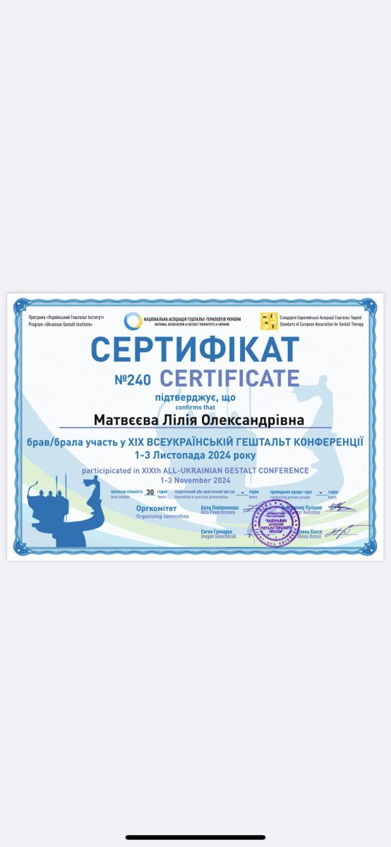 - Сертификат Основы Гештальт Терапии с 2021 года