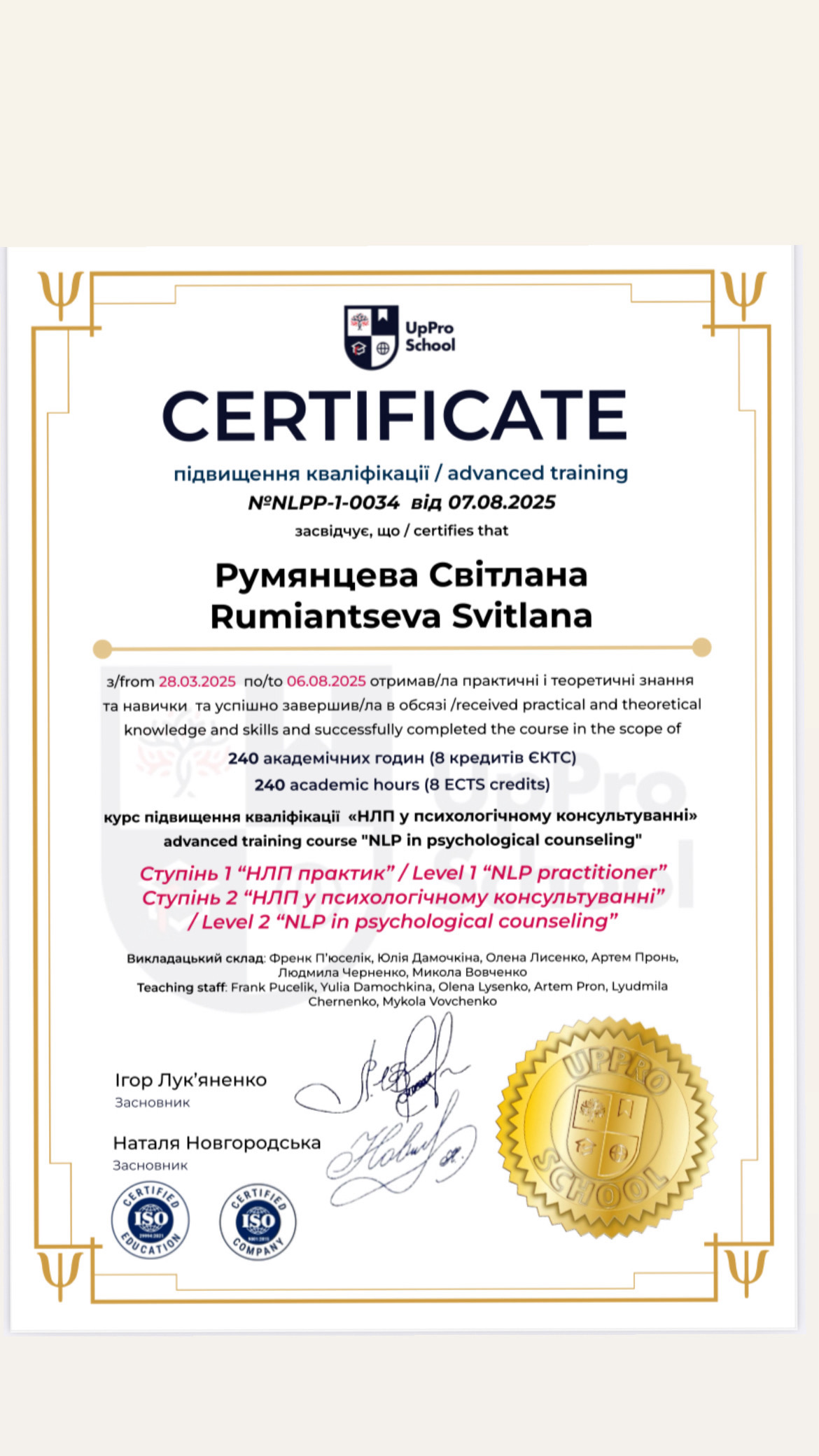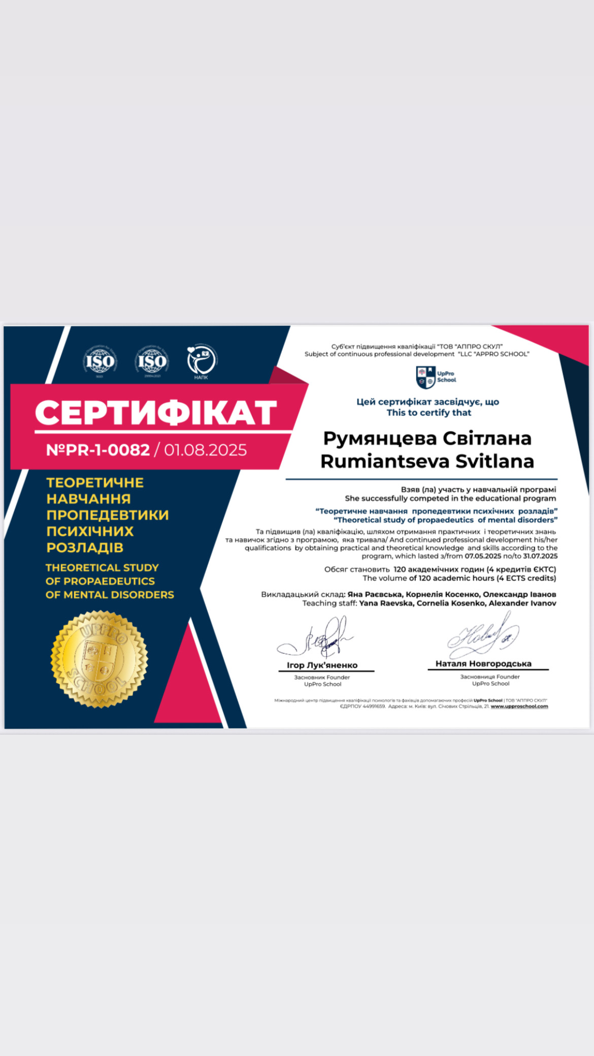 - Сертификат курси підвищення кваліфікації науково-педагогічних працівників Університету за лідерським модулем с 2018 года